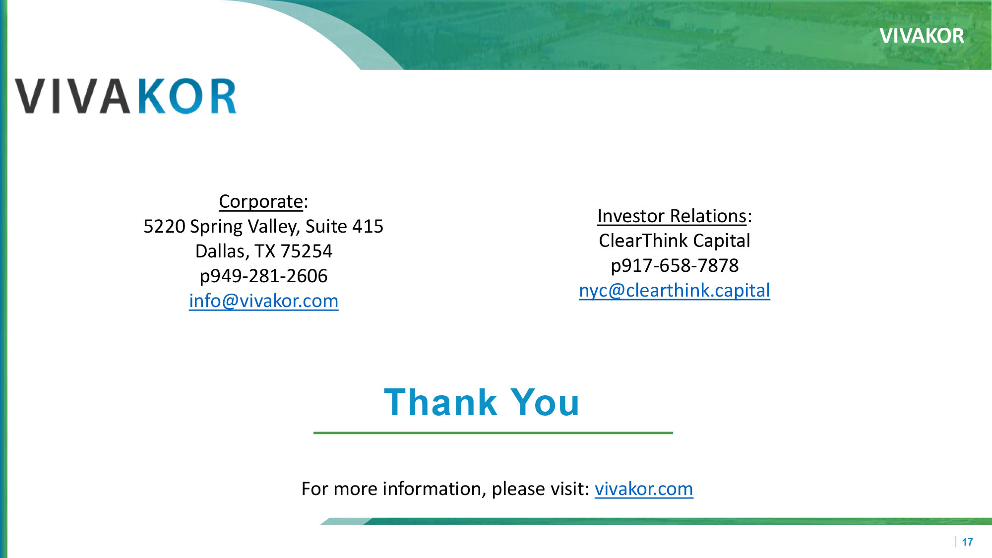 VIVAKOR 17 Thank You Corporate : 5220 Spring Valley, Suite 415 Dallas, TX 75254 p949 - 281 - 2606 info@vivakor.com Investor Relations : ClearThink Capital p917 - 658 - 7878 nyc@clearthink.capital For more information, please visit: vivakor.com