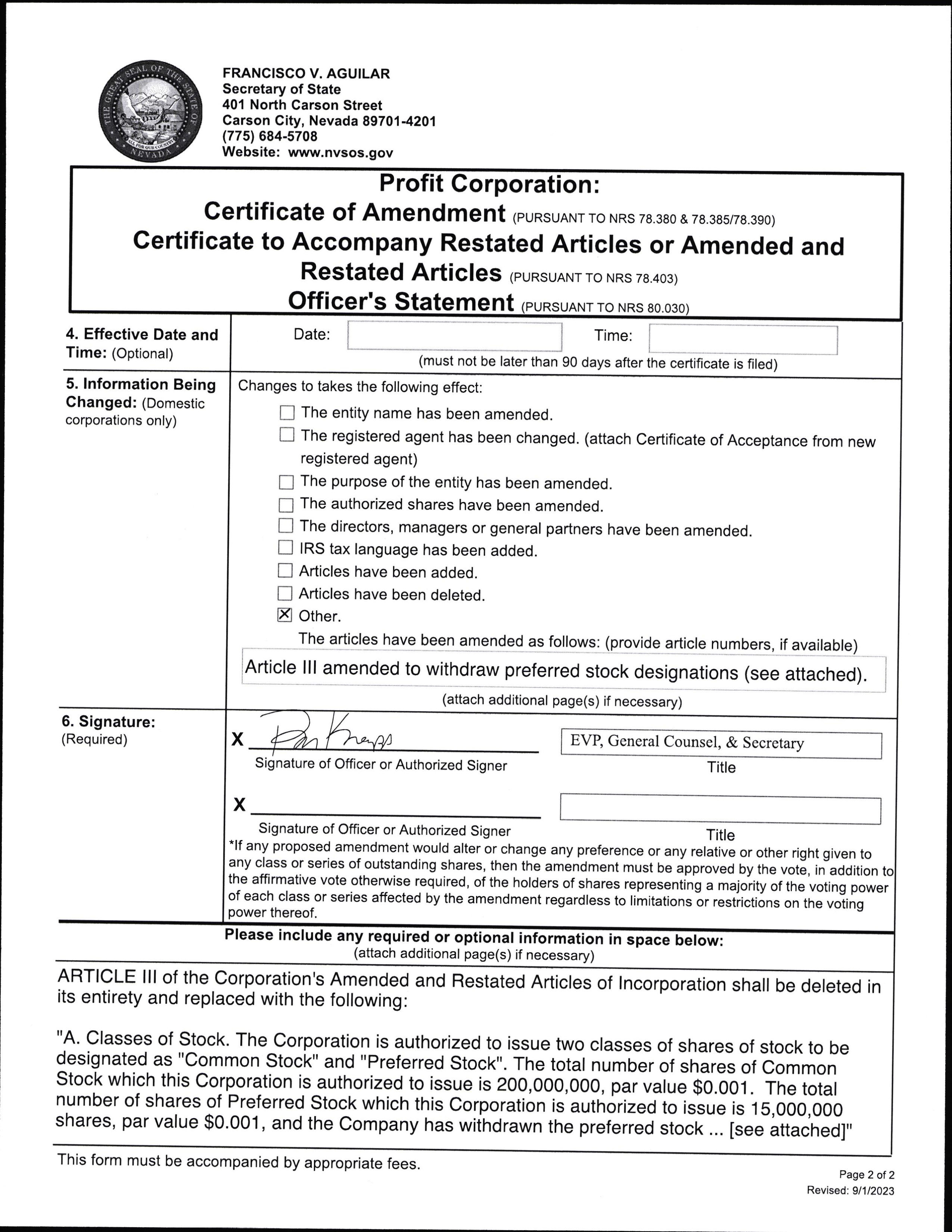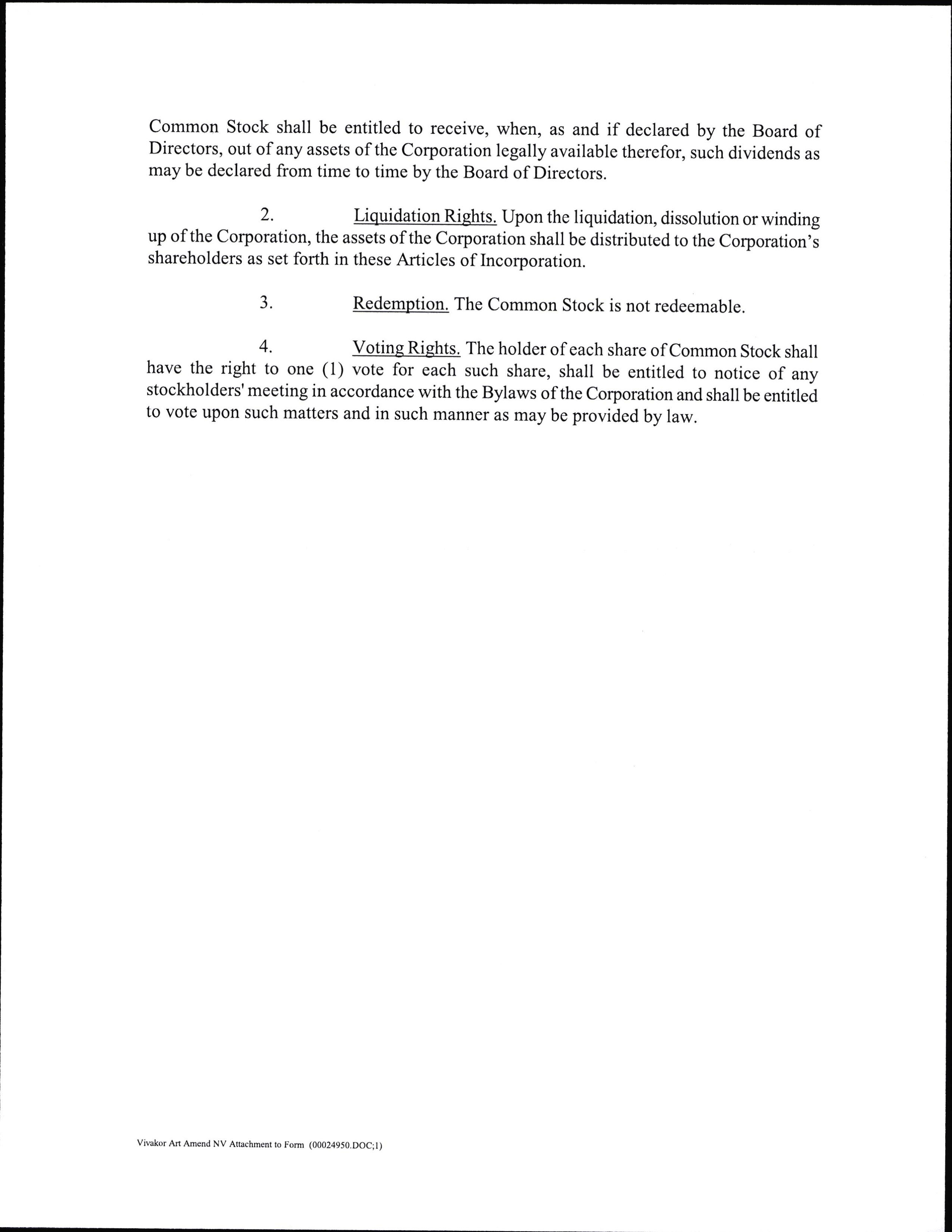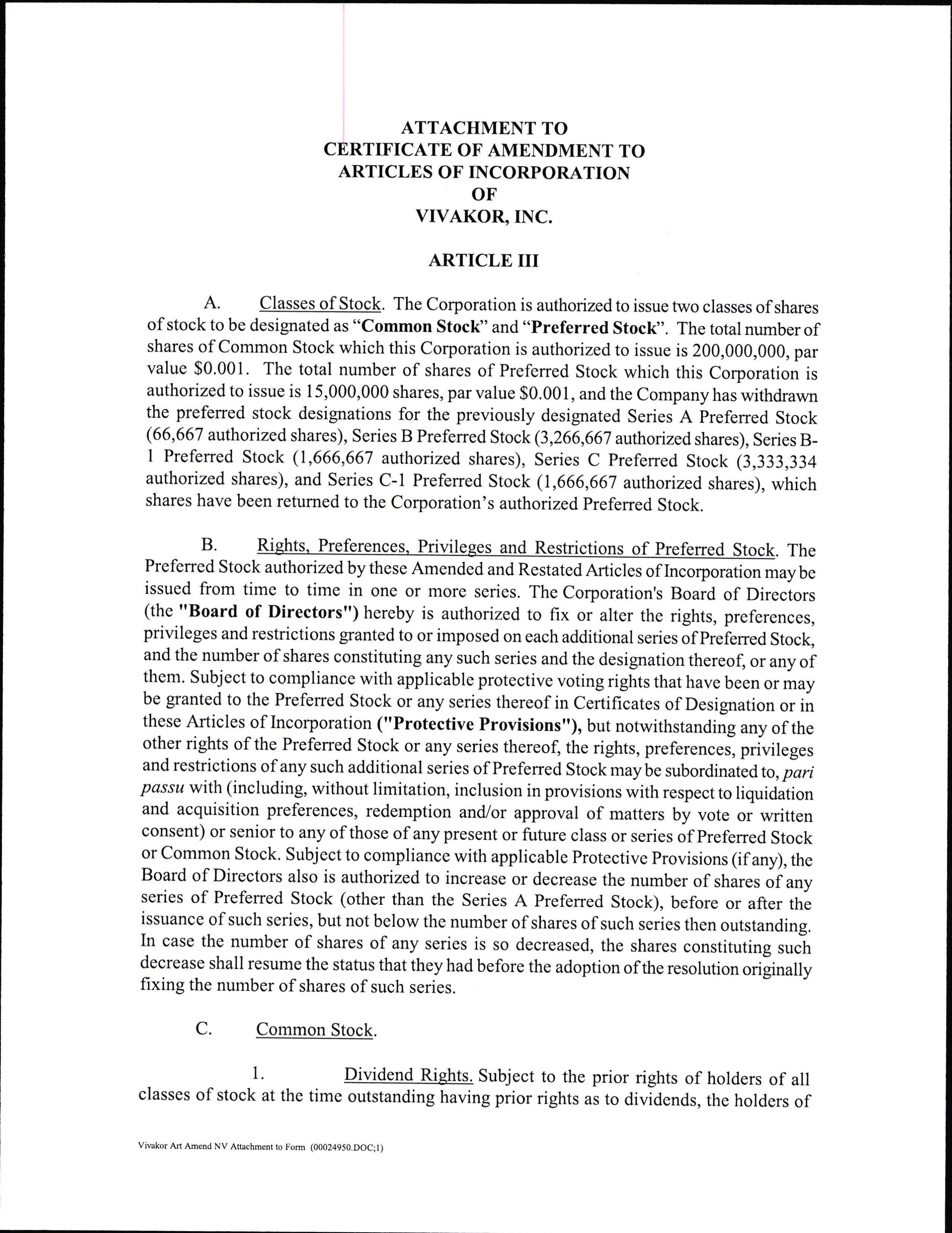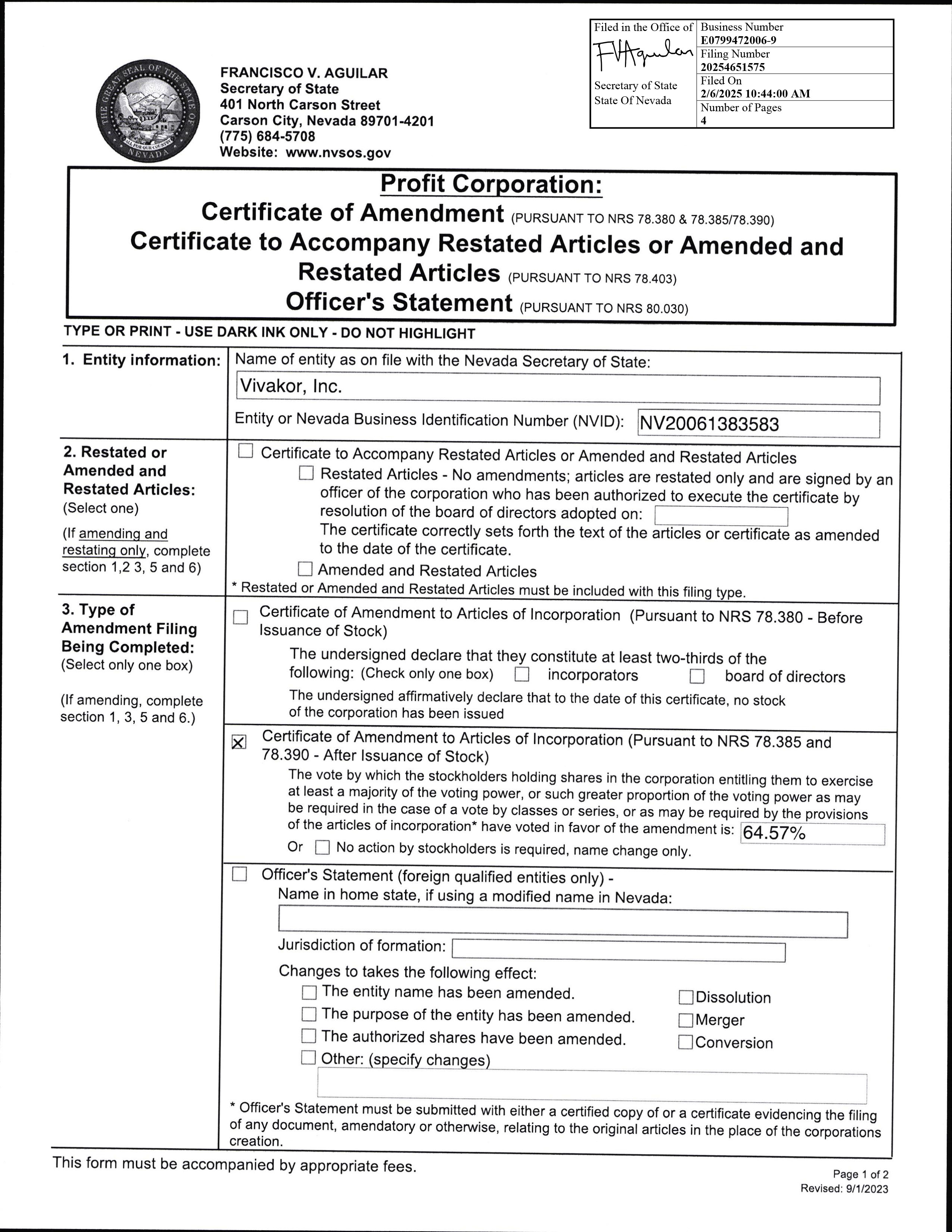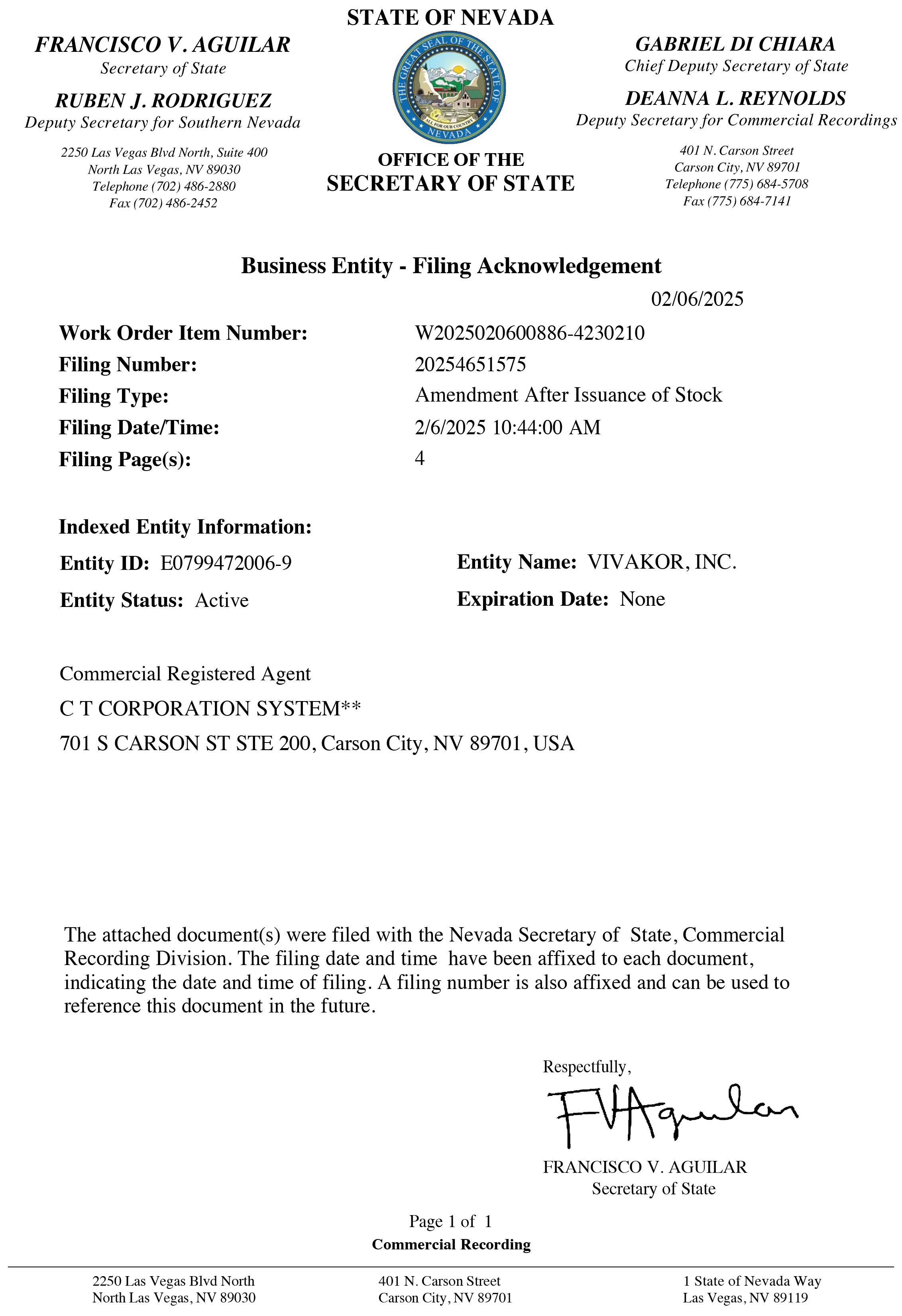 FRANCISCO V. AGUILARSecretary of StateRUBEN J. RODRIGUEZDeputy Secretary for Southern Nevada2250 Las Vegas Blvd North, Suite 400 North Las Vegas, NV 89030 Telephone (702) 486-2880Fax (702) 486-2452STATE OF NEVADAOFFICE OF THESECRETARY OF STATEGABRIEL DI CHIARAChief Deputy Secretary of StateDEANNA L. REYNOLDSDeputy Secretary for Commercial Recordings401 N. Carson Street Carson City, NV 89701 Telephone (775) 684-5708Fax (775) 684-7141Business Entity - Filing Acknowledgement02/06/2025Work Order Item Number: W2025020600886-4230210Filing Number: 20254651575Filing Type: Amendment After Issuance of StockFiling Date/Time: 2/6/2025 10:44:00 AMFiling Page(s): 4Indexed Entity Information:Entity ID: E0799472006-9 Entity Name: VIVAKOR, INC.Entity Status: Active Expiration Date: NoneCommercial Registered AgentC T CORPORATION SYSTEM**701 S CARSON ST STE 200, Carson City, NV 89701, USAThe attached document(s) were filed with the Nevada Secretary of State, Commercial Recording Division. The filing date and time have been affixed to each document, indicating the date and time of filing. A filing number is also affixed and can be used to reference this document in the future.Respectfully, Page 1 of 1Commercial RecordingFRANCISCO V. AGUILARSecretary of State2250 Las Vegas Blvd North North Las Vegas, NV 89030401 N. Carson Street Carson City, NV 897011 State of Nevada Way Las Vegas, NV 89