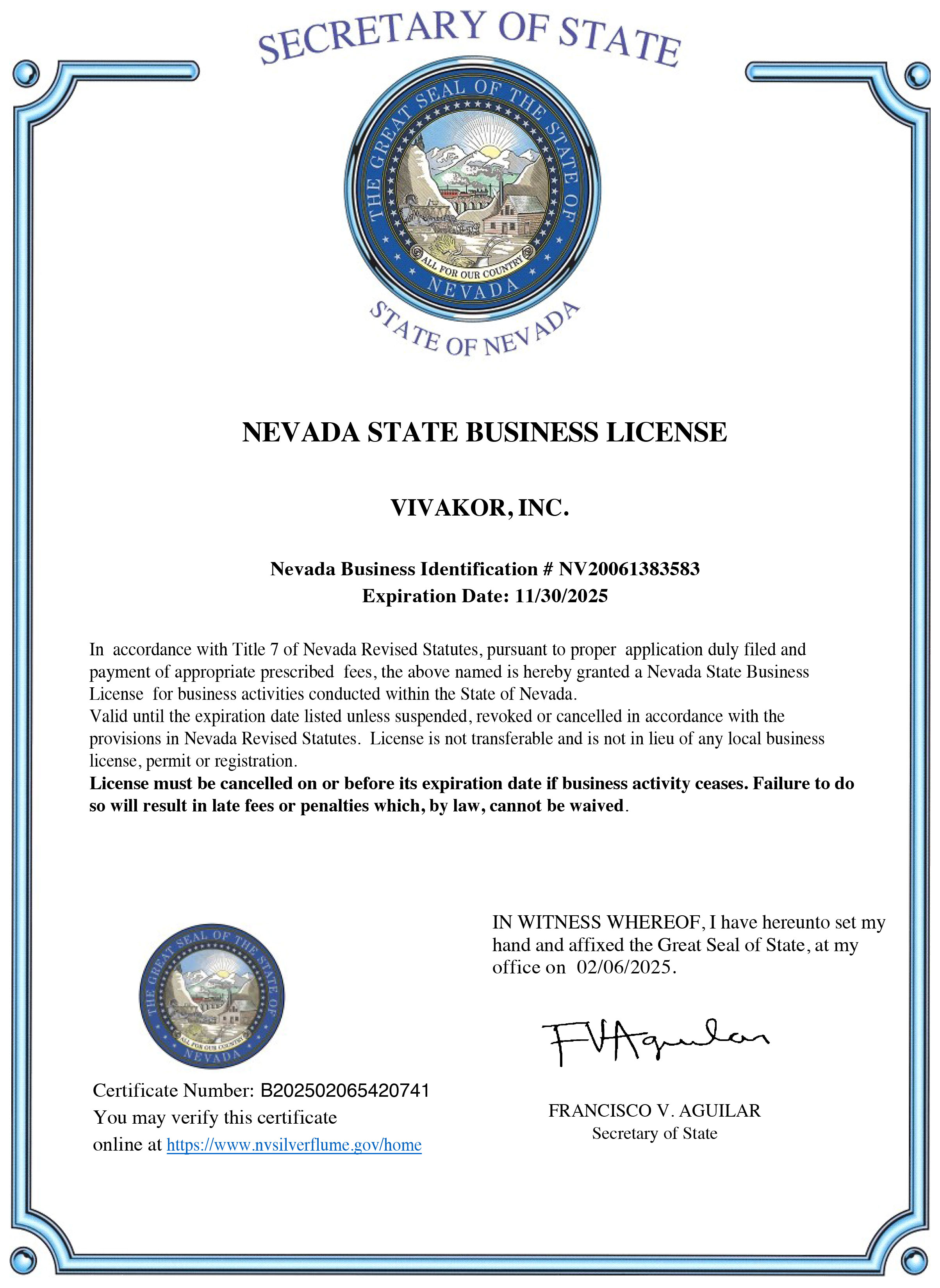 NEVADA STATE BUSINESS LICENSEVIVAKOR, INC.Nevada Business Identification # NV20061383583 Expiration Date: 11/30/2025In accordance with Title 7 of Nevada Revised Statutes, pursuant to proper application duly filed and payment of appropriate prescribed fees, the above named is hereby granted a Nevada State Business License for business activities conducted within the State of Nevada.Valid until the expiration date listed unless suspended, revoked or cancelled in accordance with the provisions in Nevada Revised Statutes. License is not transferable and is not in lieu of any local business license, permit or registration.License must be cancelled on or before its expiration date if business activity ceases. Failure to do so will result in late fees or penalties which, by law, cannot be waived.IN WITNESS WHEREOF, I have hereunto set my hand and affixed the Great Seal of State, at my office on 02/06/2025. Certificate Number: B202502065420741You may verify this certificateonline at https://www.nvsilverflume.gov/home