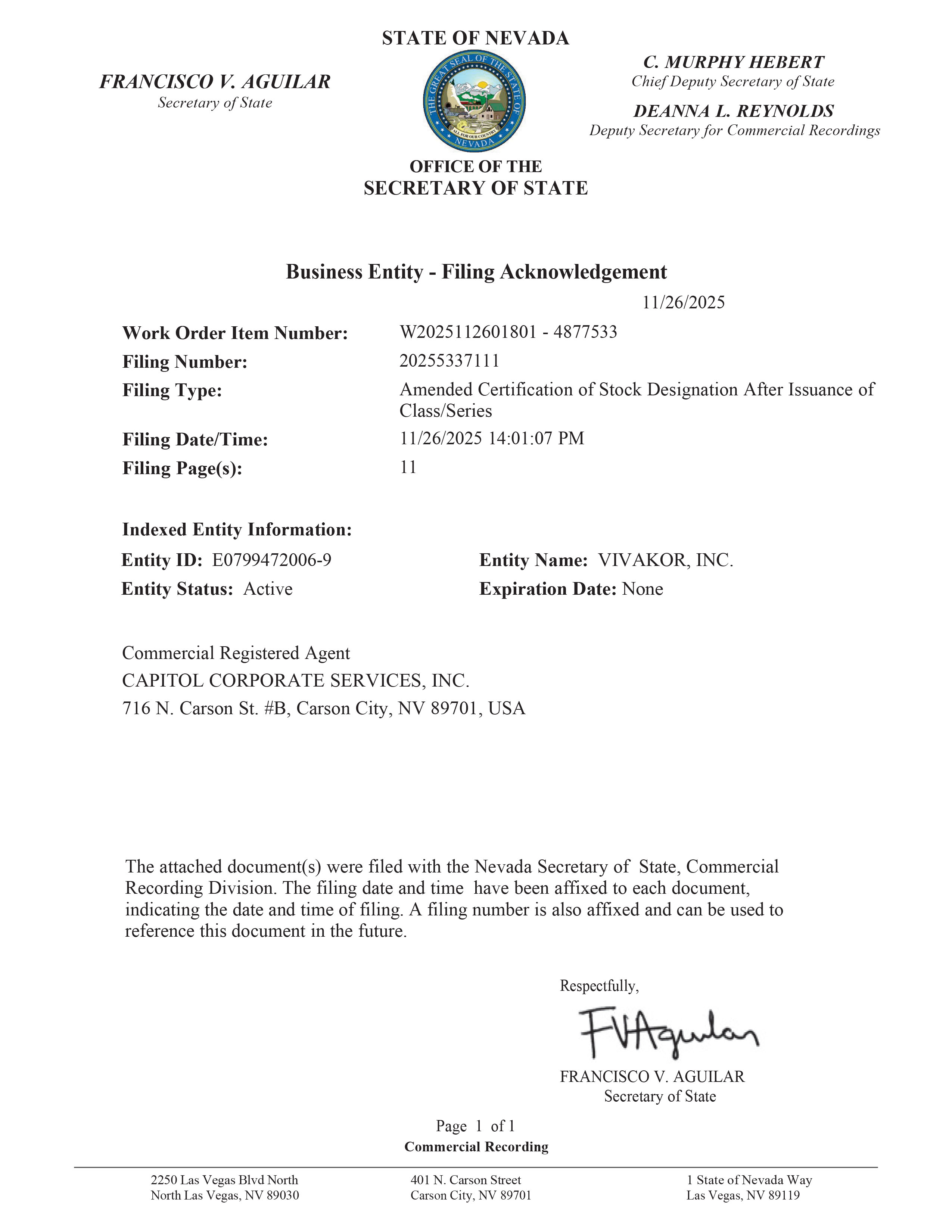 Busines s Entit y - Filin g Acknowledgement 11/26/2025 Wor k Orde r Ite m Number: Filing Number: Filing Type: W2025112601801 - 4877533 20255337111 Amende d Certification of Stoc k Designatio n Afte r Issuance of Class/Series 11/26/2025 14:01:07 PM 11 Filing Date/Time: Filing Page(s): Indexed Entity Information: Entit y ID : E079947200 6 - 9 Entit y Status : Active Entity Name : VIVAKOR , INC. Expiratio n Date : None Commercial Registered Agent CAPITO L CORPORAT E SERVICES , INC. 716 N . Carson St . #B, Carson City, N V 89701, USA FRANCISC O V . AGUILAR Secretar y o f State STAT E OF NEVADA OFFIC E O F THE SECRETAR Y OF STATE C. MURPHY HEBERT Chie f Deput y Secretar y o f State DEANNA L. REYNOLDS Deput y Secretar y fo r Commercia l Recordings The attached document(s) wer e filed wit h the Nevad a Secretar y of State , Commercial Recording Division . The filing date and time have been affixed to each document, indicating the date and time of filing. A filing number is also affixed and can be used to reference this document in the future. Respectfully, FRANCISCO V . AGUILAR Secretary of State Pag e 1 of 1 Commercial Recording 225 0 La s Vega s Blv d North Nort h Las Vegas , N V 89030 40 1 N . Carso n Street Carson City, N V 89701 1 Stat e o f Nevad a Way Las Vegas , N V 89119