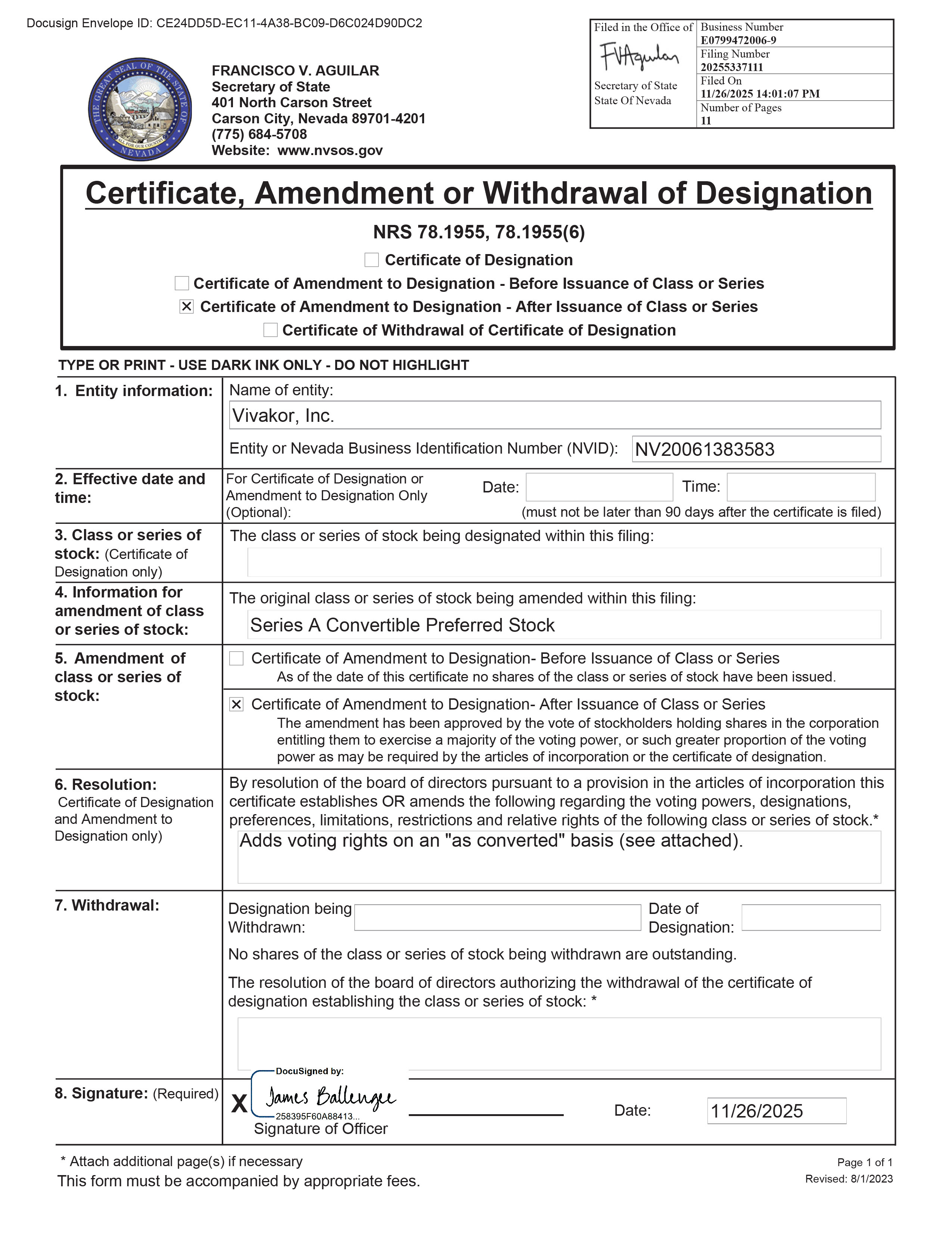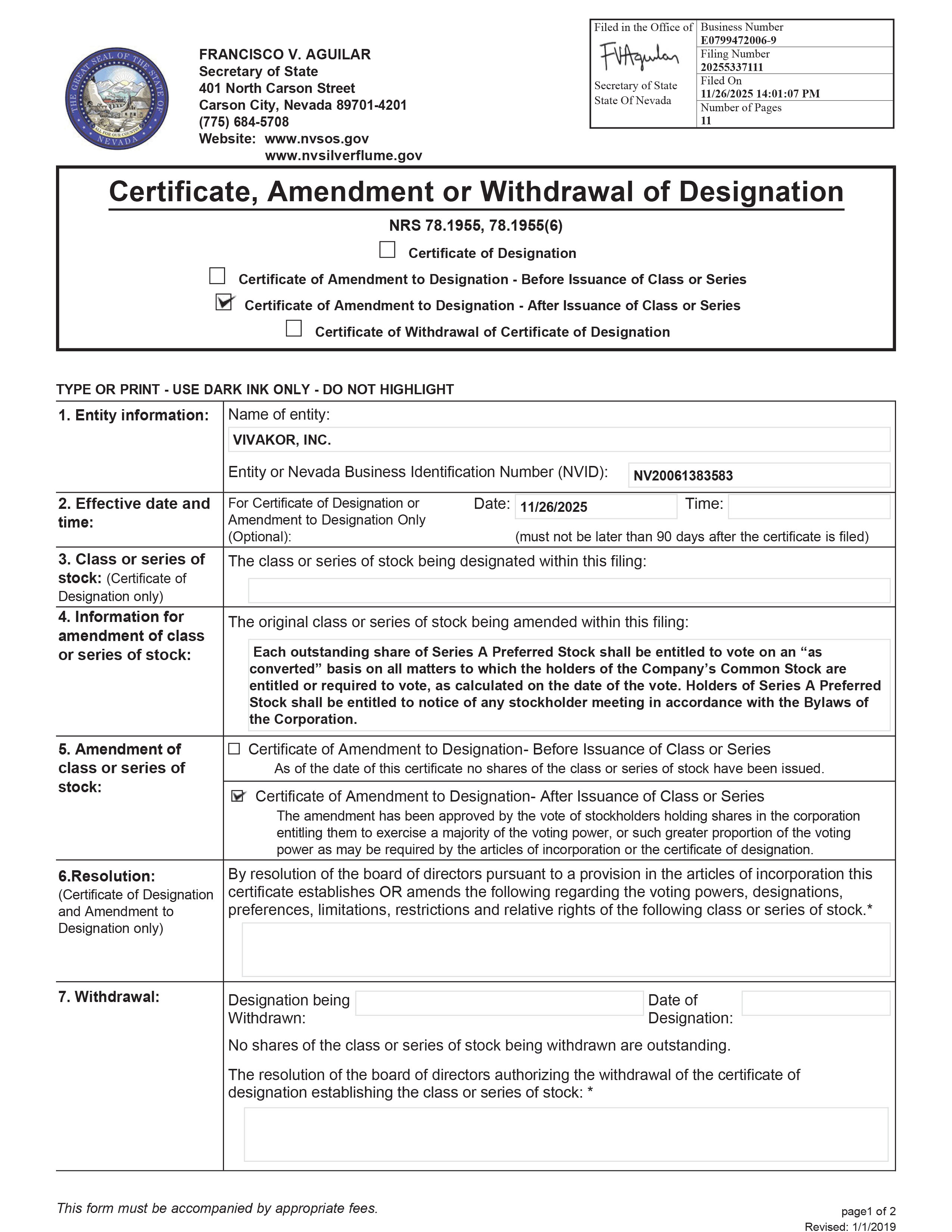 FRANCISCO V. AGUILAR Secretar y o f State 40 1 Nort h Carso n Street Carso n City, Nevada 89701 - 4201 (775) 68 4 - 5708 Website : www.nvsos.gov www.nvsilverflume.gov Certificate , Amendmen t o r Withdrawa l o f Designation NR S 78.1955 , 78.1955(6) Certificat e o f Designation Certificat e o f Amendmen t t o Designation - Befor e Issuanc e o f Clas s or Series Certificat e o f Amendmen t t o Designation - Afte r Issuanc e o f Clas s or Series Certificat e o f Withdrawa l o f Certificat e o f Designation TYP E O R PRIN T - US E DAR K INK ONLY - D O NO T HIGHLIGHT This form must be accompanied by appropriate fees. page 1 o f 2 Revised : 1/1/2019 Nam e o f entity: VIVAKOR, INC. Entity o r Nevad a Business Identification Numbe r (NVID) : NV20061383583 1 . Entity information: Time: 11/26/2025 Fo r Certificat e o f Designatio n o r Date: 2. Effective date and time: Amendmen t t o Designatio n Only (Optional) : (mus t no t b e late r tha n 9 0 day s afte r th e certificat e i s filed) Th e clas s o r serie s o f stoc k bein g designate d withi n thi s filing: 3 . Clas s o r serie s of stock : (Certificate of Designatio n only) The origina l clas s o r serie s o f stoc k bein g amende d withi n this filing: Eac h outstandin g shar e o f Serie s A Preferre d Stoc k shal l b e entitle d t o vot e o n a n ” as converted” basis on all matters to which the holders of the Company ’ s Common Stock are entitle d o r require d t o vote , a s calculate d o n th e dat e o f th e vote . Holder s o f Serie s A Preferred Stoc k shal l b e entitle d t o notic e o f an y stockholde r meetin g i n accordanc e wit h th e Bylaw s of th e Corporation. 4 . Information for amendmen t of class o r serie s o f stock: Certificat e o f Amendmen t t o Designatio n - Befor e Issuanc e o f Clas s o r Series A s o f th e dat e o f thi s certificat e n o share s o f th e clas s o r serie s o f stoc k hav e bee n issued. 5 . Amendmen t of clas s o r serie s of stock : Certificat e o f Amendmen t to Designatio n - Afte r Issuanc e o f Clas s o r Series Th e amendmen t ha s bee n approve d b y th e vot e o f stockholder s holdin g share s i n th e corporation entitlin g the m t o exercis e a majorit y o f th e votin g power , o r suc h greate r proportio n o f th e voting powe r a s ma y b e require d b y th e article s o f incorporatio n o r th e certificat e o f designation. B y resolutio n o f the boar d o f director s pursuan t to a provisio n i n the article s o f incorporatio n this certificat e establishe s OR amend s the following regardin g the votin g powers , designations, preferences , limitations , restriction s an d relativ e right s o f the following class o r series o f stock.* 6.Resolution: (Certificat e o f Designation an d Amendmen t to Designatio n only) Designatio n bein g Dat e of Withdrawn : Designation: N o shares o f the class o r series o f stock bein g withdraw n ar e outstanding. The resolutio n o f the boar d o f director s authorizin g the withdrawa l o f the certificat e of designatio n establishin g th e clas s o r serie s o f stock : * 7 . Withdrawal: Busines s Number E0799472006 - 9 File d in the O f fic e of Secretar y o f State Stat e O f Nevada Filin g Number 20255337 11 1 File d On 1 1/26/2025 14:01:0 7 PM Numbe r o f Pages 11