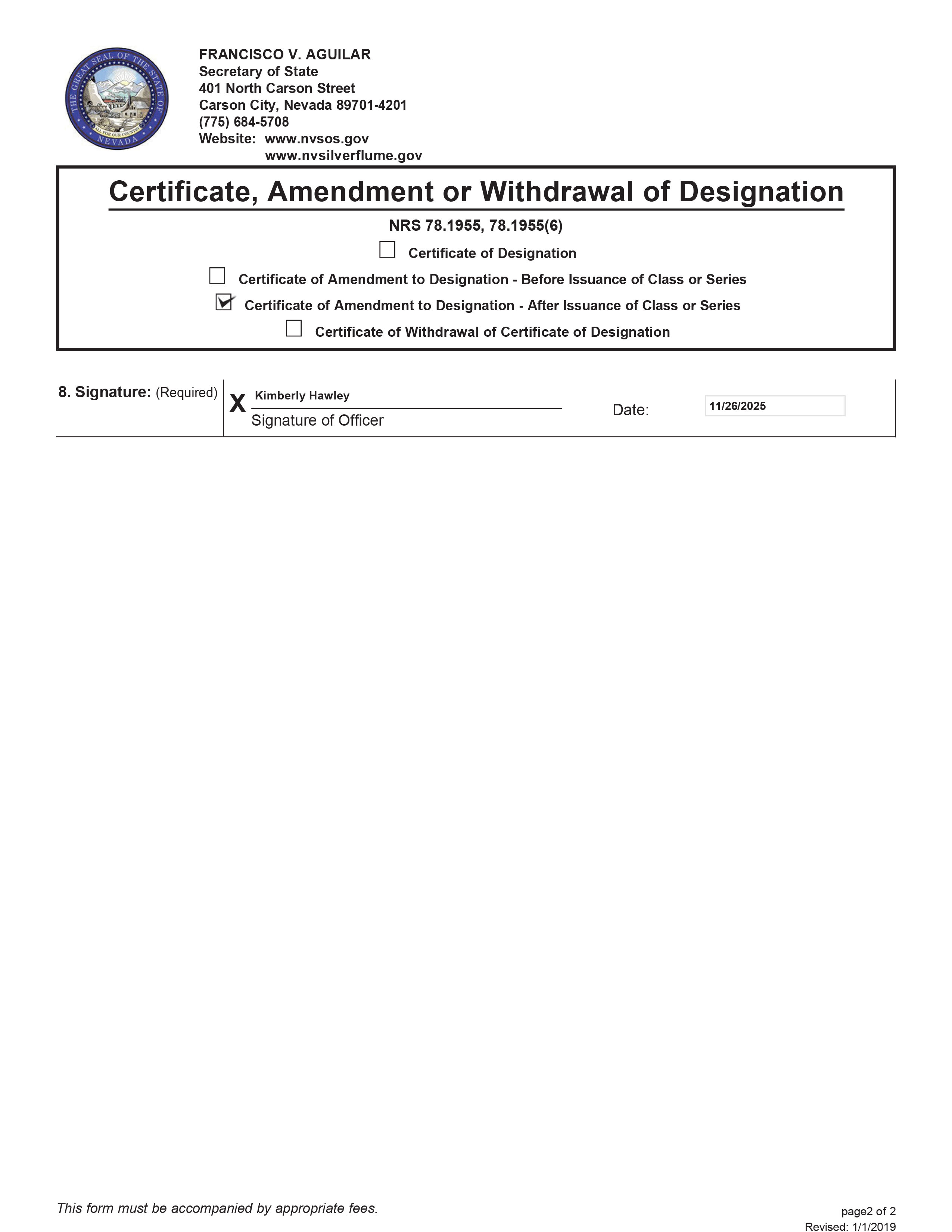 8 . Signature : (Required) X Kimberly Hawley Signature o f Officer Date: 11/26/2025 FRANCISCO V. AGUILAR Secretar y o f State 40 1 Nort h Carso n Street Carso n City, Nevada 89701 - 4201 (775) 68 4 - 5708 Website : www.nvsos.gov www.nvsilverflume.gov Certificate , Amendmen t o r Withdrawa l o f Designation NR S 78.1955 , 78.1955(6) Certificat e o f Designation Certificat e o f Amendmen t t o Designation - Befor e Issuanc e o f Clas s or Series Certificat e o f Amendmen t t o Designation - Afte r Issuanc e o f Clas s or Series Certificat e o f Withdrawa l o f Certificat e o f Designation This form must be accompanied by appropriate fees. page 2 o f 2 Revised : 1/1/2019