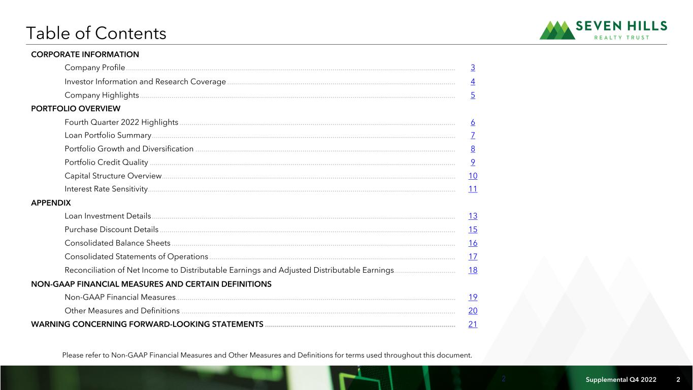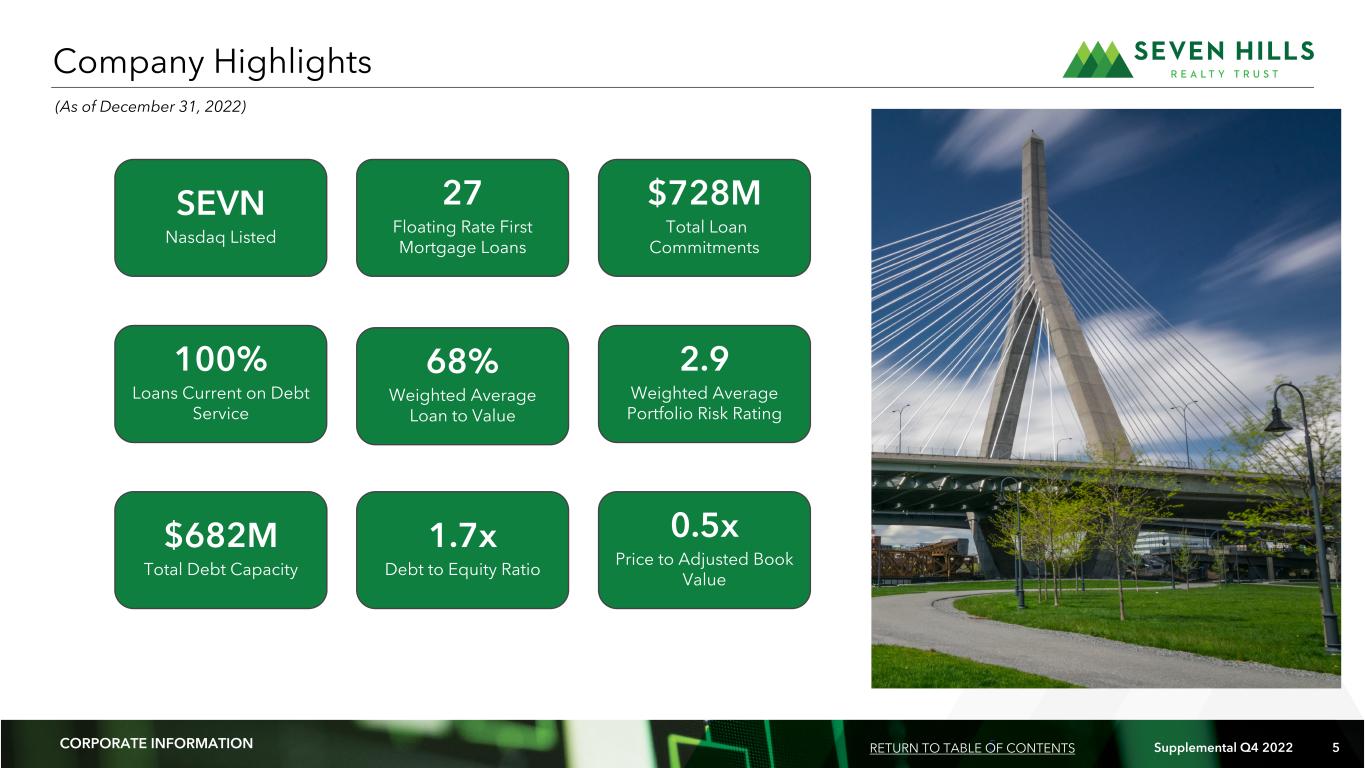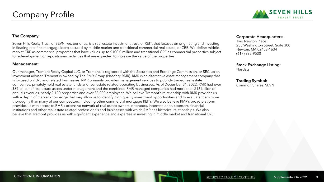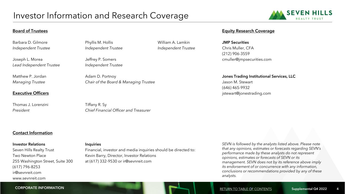 3 Supplemental Q4 2022 3 Management: Our manager, Tremont Realty Capital LLC, or Tremont, is registered with the Securities and Exchange Commission, or SEC, as an investment adviser. Tremont is owned by The RMR Group (Nasdaq: RMR). RMR is an alternative asset management company that is focused on CRE and related businesses. RMR primarily provides management services to publicly traded real estate companies, privately held real estate funds and real estate related operating businesses. As of December 31, 2022, RMR had over $37 billion of real estate assets under management and the combined RMR managed companies had more than $16 billion of annual revenues, nearly 2,100 properties and over 38,000 employees. We believe Tremont’s relationship with RMR provides us with a depth of market knowledge that may allow us to identify high quality investment opportunities and to evaluate them more thoroughly than many of our competitors, including other commercial mortgage REITs. We also believe RMR’s broad platform provides us with access to RMR’s extensive network of real estate owners, operators, intermediaries, sponsors, financial institutions and other real estate related professionals and businesses with which RMR has historical relationships. We also believe that Tremont provides us with significant experience and expertise in investing in middle market and transitional CRE. The Company: Seven Hills Realty Trust, or SEVN, we, our or us, is a real estate investment trust, or REIT, that focuses on originating and investing in floating rate first mortgage loans secured by middle market and transitional commercial real estate, or CRE. We define middle market CRE as commercial properties that have values up to $100.0 million and transitional CRE as commercial properties subject to redevelopment or repositioning activities that are expected to increase the value of the properties. Corporate Headquarters: Two Newton Place 255 Washington Street, Suite 300 Newton, MA 02458-1634 (617) 332-9530 Stock Exchange Listing: Nasdaq Trading Symbol: Common Shares: SEVN Company Profile RETURN TO TABLE OF CONTENTSCORPORATE INFORMATION
