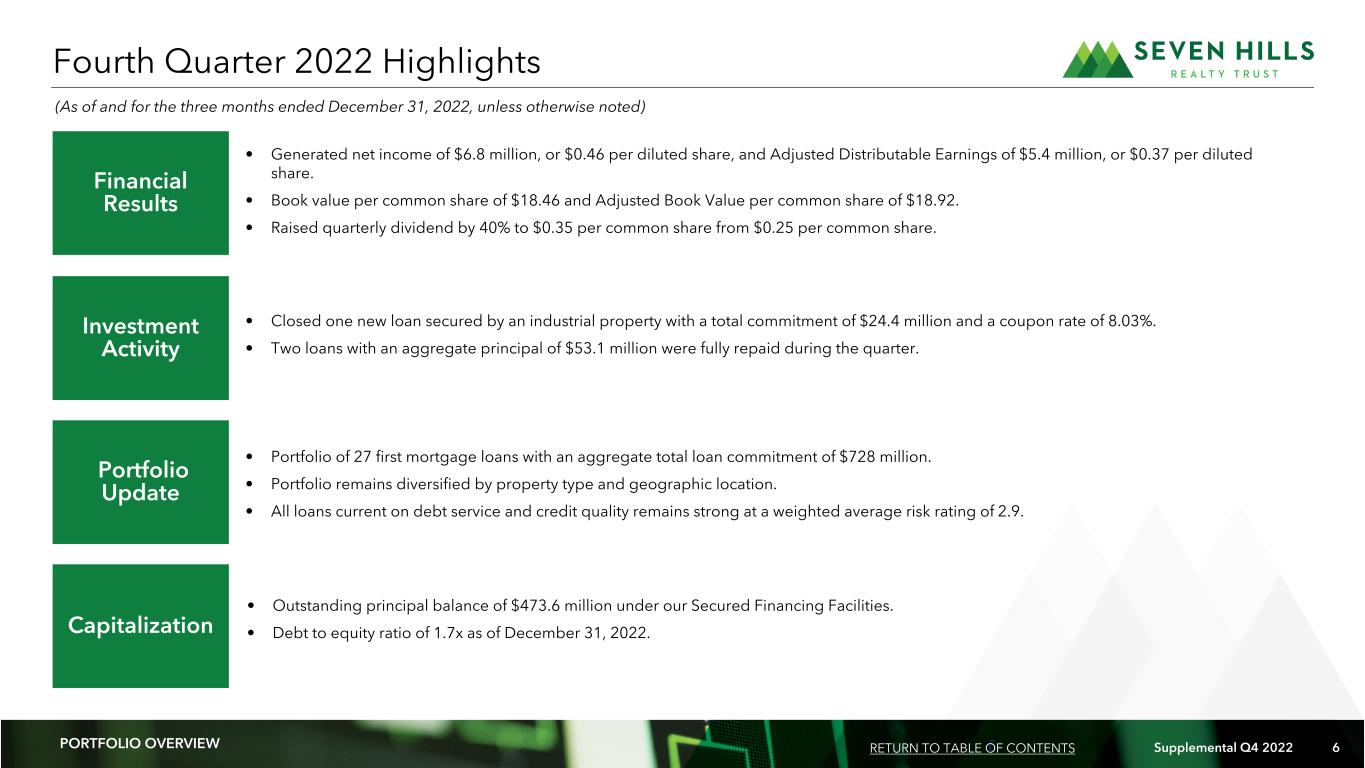 5 Supplemental Q4 2022 5 Company Highlights CORPORATE INFORMATION 27 Floating Rate First Mortgage Loans SEVN Nasdaq Listed $728M Total Loan Commitments 100% Loans Current on Debt Service $682M Total Debt Capacity 68% Weighted Average Loan to Value 1.7x Debt to Equity Ratio 2.9 Weighted Average Portfolio Risk Rating 0.5x Price to Adjusted Book Value RETURN TO TABLE OF CONTENTS Student Housing Acquisition Financing Starkville, MS (As of December 31, 2022)