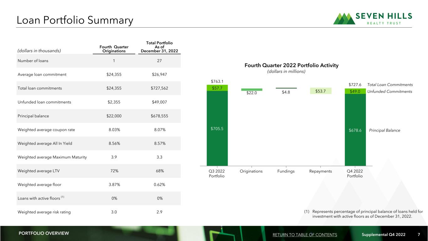 6 Supplemental Q4 2022 6 Financial Results Investment Activity Portfolio Update Capitalization • Generated net income of $6.8 million, or $0.46 per diluted share, and Adjusted Distributable Earnings of $5.4 million, or $0.37 per diluted share. • Book value per common share of $18.46 and Adjusted Book Value per common share of $18.92. • Raised quarterly dividend by 40% to $0.35 per common share from $0.25 per common share. • Portfolio of 27 first mortgage loans with an aggregate total loan commitment of $728 million. • Portfolio remains diversified by property type and geographic location. • All loans current on debt service and credit quality remains strong at a weighted average risk rating of 2.9. • Closed one new loan secured by an industrial property with a total commitment of $24.4 million and a coupon rate of 8.03%. • Two loans with an aggregate principal of $53.1 million were fully repaid during the quarter. • Outstanding principal balance of $473.6 million under our Secured Financing Facilities. • Debt to equity ratio of 1.7x as of December 31, 2022. Fourth Quarter 2022 Highlights PORTFOLIO OVERVIEW RETURN TO TABLE OF CONTENTS (As of and for the three months ended December 31, 2022, unless otherwise noted)