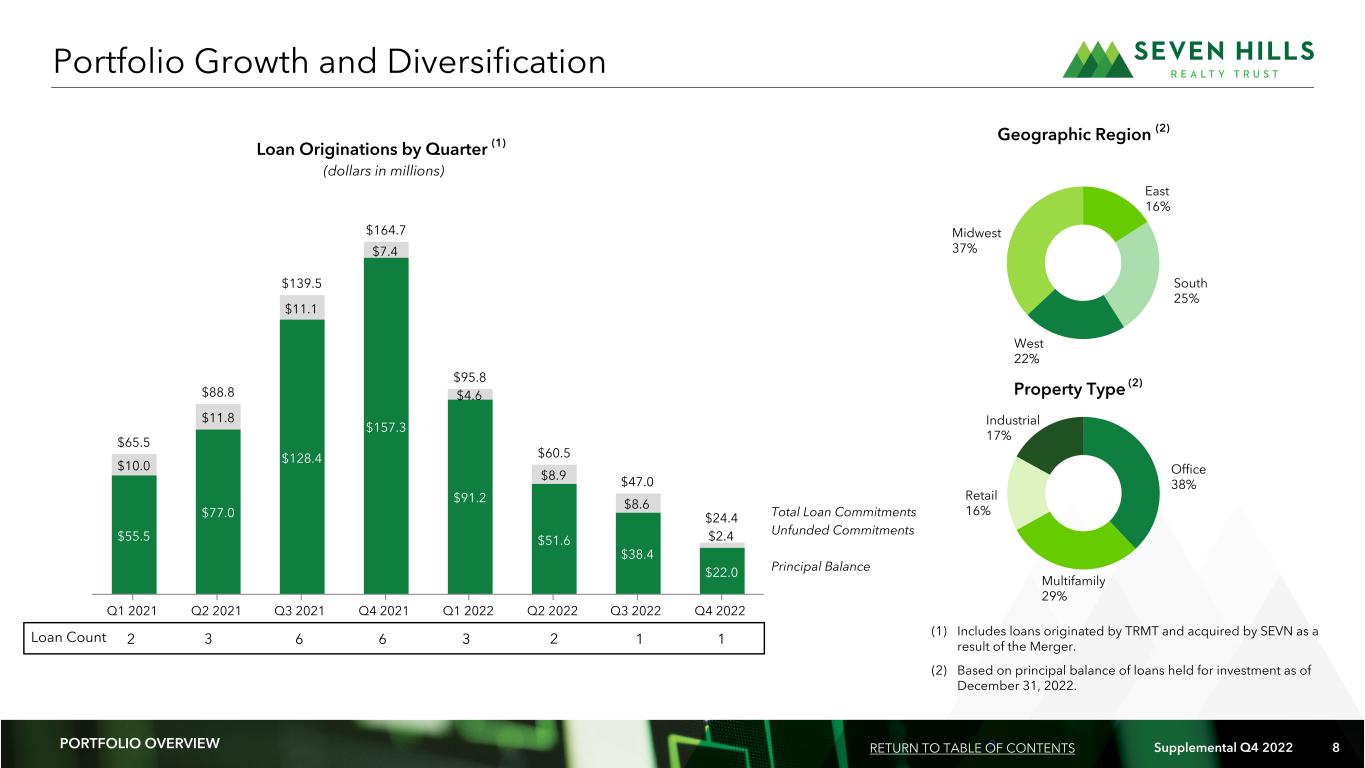 7 Supplemental Q4 2022 7 $705.5 $705.5 $727.5 $678.6 $678.6 $22.0 $4.8 $53.7 $57.7 $49.0 Q3 2022 Portfolio Originations Fundings Repayments Q4 2022 Portfolio Fourth Quarter 2022 Portfolio Activity (dollars in millions) Total Loan Commitments (dollars in thousands) Fourth Quarter Originations Total Portfolio As of December 31, 2022 Number of loans 1 27 Average loan commitment $24,355 $26,947 Total loan commitments $24,355 $727,562 Unfunded loan commitments $2,355 $49,007 Principal balance $22,000 $678,555 Weighted average coupon rate 8.03% 8.07% Weighted average All In Yield 8.56% 8.57% Weighted average Maximum Maturity 3.9 3.3 Weighted average LTV 72% 68% Weighted average floor 3.87% 0.62% Loans with active floors (1) 0% 0% Weighted average risk rating 3.0 2.9 Principal Balance Loan Portfolio Summary PORTFOLIO OVERVIEW RETURN TO TABLE OF CONTENTS $763.1 $727.6 Unfunded Commitments (1) Represents percentage of principal balance of loans held for investment with active floors as of December 31, 2022.
