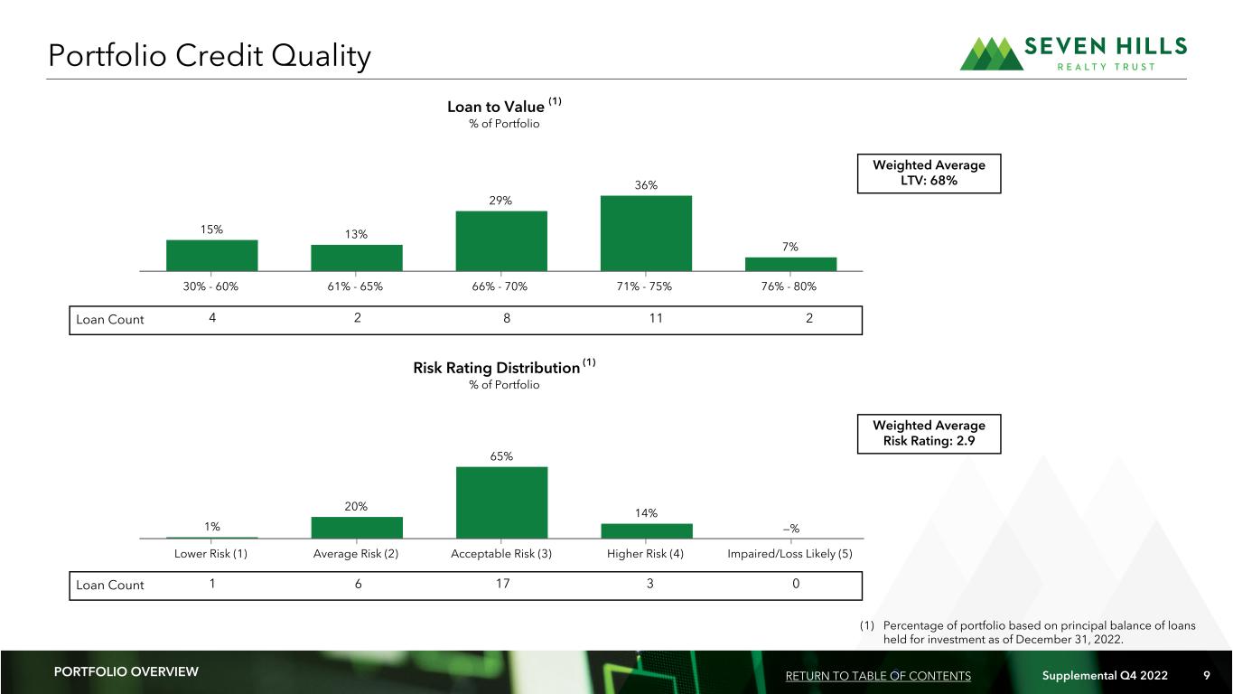 8 Supplemental Q4 2022 8 Retail East 16% South 25% West 22% Midwest 37% Office 38% Multifamily 29% Retail 16% Industrial 17% Geographic Region (2) Property Type (2) (dollars in millions) Portfolio Growth and Diversification (1) Includes loans originated by TRMT and acquired by SEVN as a result of the Merger. (2) Based on principal balance of loans held for investment as of December 31, 2022. $55.5 $77.0 $128.4 $157.3 $91.2 $51.6 $38.4 $22.0 $10.0 $11.8 $11.1 $7.4 $4.6 $8.9 $8.6 $2.4 $65.5 $88.8 $139.5 $164.7 $95.8 $60.5 $47.0 $24.4 Q1 2021 Q2 2021 Q3 2021 Q4 2021 Q1 2022 Q2 2022 Q3 2022 Q4 2022 Total Loan Commitments Unfunded Commitments Principal Balance Loan Originations by Quarter (1) PORTFOLIO OVERVIEW Loan Count 6 6 3 2 RETURN TO TABLE OF CONTENTS 32 1 1
