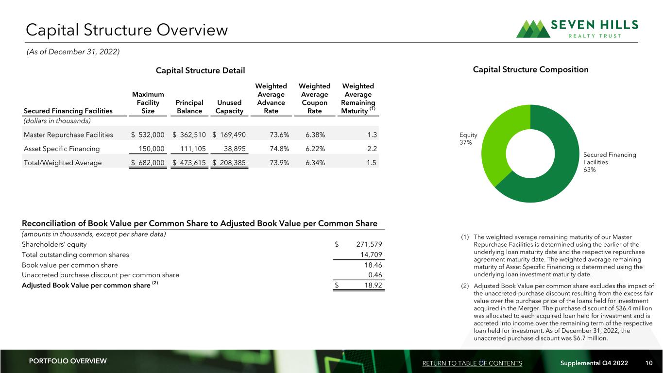 9 Supplemental Q4 2022 9 Loan Count 15% 13% 29% 36% 7% 30% - 60% 61% - 65% 66% - 70% 71% - 75% 76% - 80% Loan to Value (1) % of Portfolio Portfolio Credit Quality Loan Count 4 2 8 11 2 1 6 17 3 0 1% 20% 65% 14% —% Lower Risk (1) Average Risk (2) Acceptable Risk (3) Higher Risk (4) Impaired/Loss Likely (5) Risk Rating Distribution (1) % of Portfolio Weighted Average LTV: 68% Weighted Average Risk Rating: 2.9 (1) Percentage of portfolio based on principal balance of loans held for investment as of December 31, 2022. PORTFOLIO OVERVIEW RETURN TO TABLE OF CONTENTS