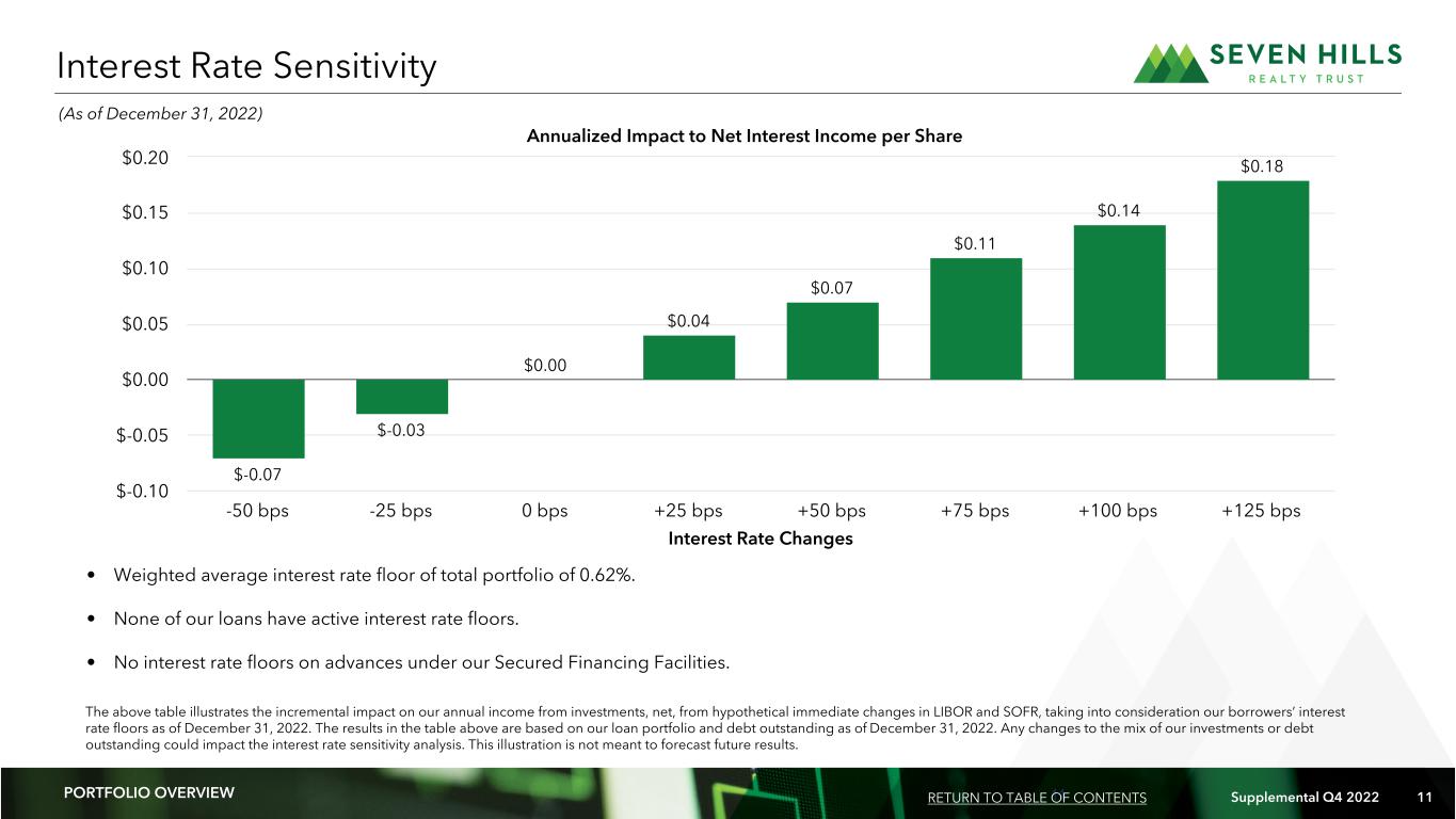 10 Supplemental Q4 2022 10 CA PI TA L ST RU CT UR E OV ER VI EW Secured Financing Facilities Maximum Facility Size Principal Balance Unused Capacity Weighted Average Advance Rate Weighted Average Coupon Rate Weighted Average Remaining Maturity (1) (dollars in thousands) Master Repurchase Facilities $ 532,000 $ 362,510 $ 169,490 73.6% 6.38% 1.3 Asset Specific Financing 150,000 111,105 38,895 74.8% 6.22% 2.2 Total/Weighted Average $ 682,000 $ 473,615 $ 208,385 73.9% 6.34% 1.5 Capital Structure Detail (1) The weighted average remaining maturity of our Master Repurchase Facilities is determined using the earlier of the underlying loan maturity date and the respective repurchase agreement maturity date. The weighted average remaining maturity of Asset Specific Financing is determined using the underlying loan investment maturity date. (2) Adjusted Book Value per common share excludes the impact of the unaccreted purchase discount resulting from the excess fair value over the purchase price of the loans held for investment acquired in the Merger. The purchase discount of $36.4 million was allocated to each acquired loan held for investment and is accreted into income over the remaining term of the respective loan held for investment. As of December 31, 2022, the unaccreted purchase discount was $6.7 million. Secured Financing Facilities 63% Equity 37% Capital Structure Overview Capital Structure Composition RETURN TO TABLE OF CONTENTS PORTFOLIO OVERVIEW RETURN TO TABLE OF CONTENTS (As of December 31, 2022) Reconciliation of Book Value per Common Share to Adjusted Book Value per Common Share (amounts in thousands, except per share data) Shareholders’ equity $ 271,579 Total outstanding common shares 14,709 Book value per common share 18.46 Unaccreted purchase discount per common share 0.46 Adjusted Book Value per common share (2) $ 18.92