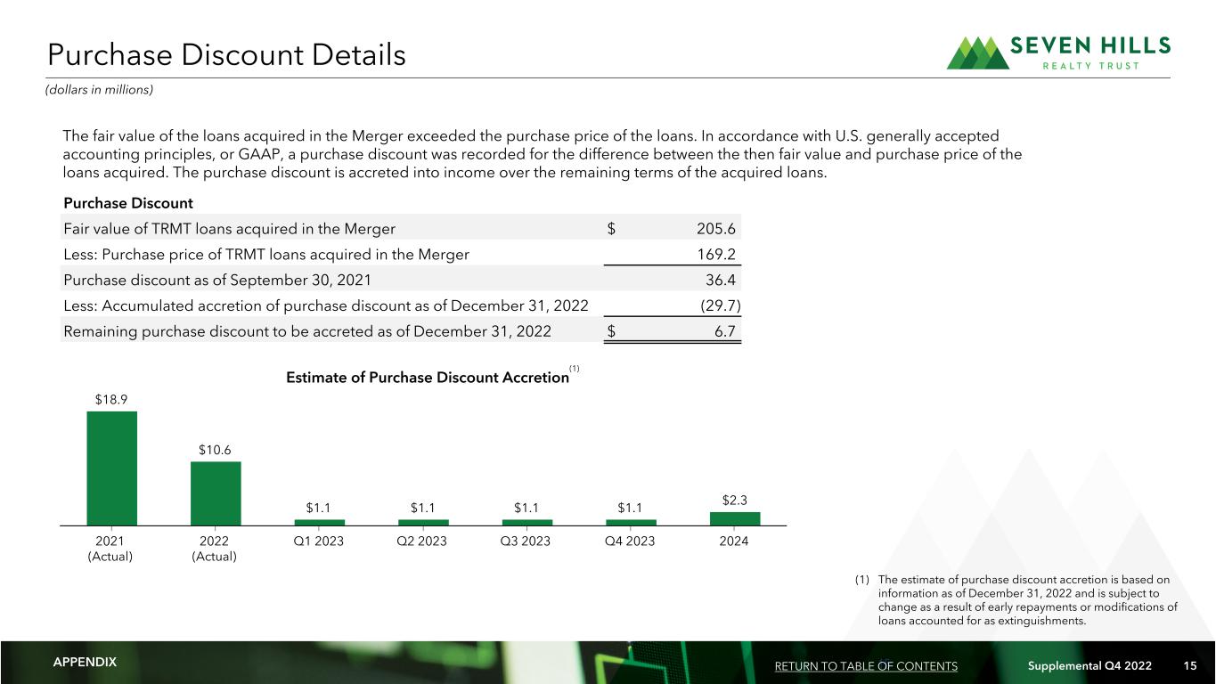 14 Supplemental Q4 2022 14 First mortgage loans as of December 31, 2022: # Location Property Type Origination Date Committed Principal Amount Principal Balance (1) Coupon Rate All in Yield Maturity Date Maximum Maturity Date LTV Risk Rating 15 Downers Grove, IL Office 12/09/2021 23,530 23,530 L + 4.25% L + 4.57% 12/09/2024 12/09/2026 72% 3 16 Dublin, OH Office 02/18/2020 22,820 22,507 S + 3.75% S + 4.95% 02/18/2023 02/18/2023 33% 2 17 Bellevue, WA Office 11/05/2021 21,000 20,000 L + 3.85% L + 4.19% 11/05/2024 11/05/2026 68% 3 18 Portland, OR Multifamily 07/09/2021 19,687 19,687 L + 3.57% L + 3.97% 07/09/2024 07/09/2026 75% 3 19 Ames, IA Multifamily 11/15/2021 18,000 17,820 L + 3.80% L + 4.13% 11/15/2024 11/15/2026 71% 2 20 Aurora, IL Office / Industrial 12/18/2020 17,460 16,429 L + 4.35% L + 5.01% 12/18/2023 12/18/2024 73% 2 21 Yardley, PA Office 12/19/2019 16,500 15,583 L + 4.58% L + 5.97% 12/19/2023 12/19/2024 75% 4 22 Sandy Springs, GA Retail 09/23/2021 16,489 15,017 L + 3.75% L + 4.11% 09/23/2024 09/23/2026 72% 3 23 Delray Beach, FL Retail 03/18/2022 16,000 15,149 S + 4.25% S + 4.91% 03/18/2024 03/18/2026 56% 3 24 Westminster, CO Office 05/25/2021 15,750 14,634 L + 3.75% L + 4.25% 05/25/2024 05/25/2026 66% 2 25 Portland, OR Multifamily 07/30/2021 13,400 13,400 L + 3.57% L + 3.98% 07/30/2024 07/30/2026 71% 3 26 Seattle, WA Multifamily 08/16/2021 12,500 12,354 L + 3.55% L + 3.89% 08/16/2024 08/16/2026 70% 3 27 Allentown, PA Industrial 01/24/2020 9,775 9,775 S + 3.50% S + 4.03% 01/24/2024 01/24/2025 67% 1 Total/weighted average $ 727,562 $ 678,555 + 3.78% + 4.28% 68% 2.9 Loan Investment Details (Continued) (dollars in thousands) APPENDIX RETURN TO TABLE OF CONTENTS (1) The principal balance excludes the impact of the $6,703 unaccreted purchase discount related to the Merger.