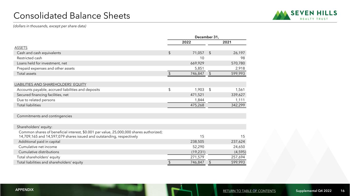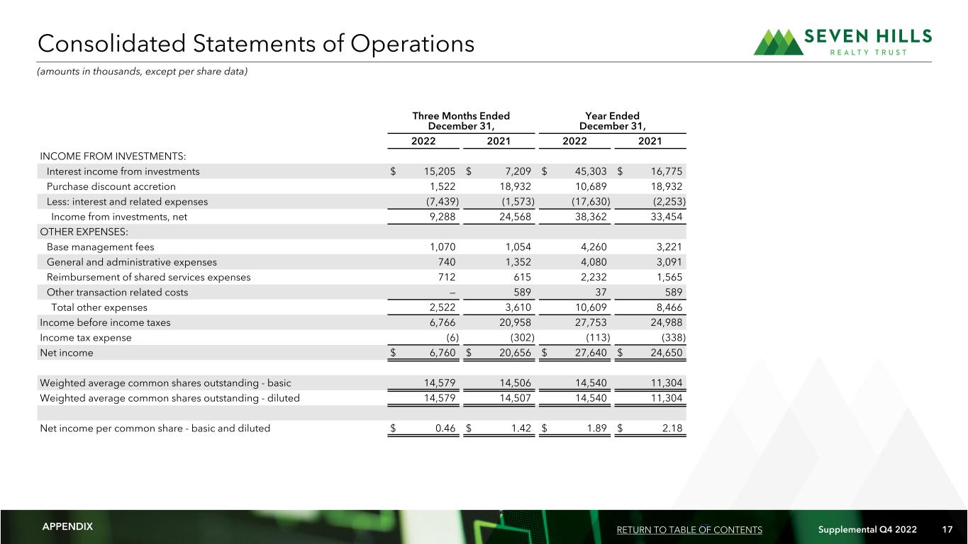 16 Supplemental Q4 2022 16 Financial Summary December 31, 2022 2021 ASSETS   Cash and cash equivalents $ 71,057 $ 26,197 Restricted cash 10 98 Loans held for investment, net 669,929 570,780 Prepaid expenses and other assets 5,851 2,918 Total assets $ 746,847 $ 599,993 LIABILITIES AND SHAREHOLDERS' EQUITY Accounts payable, accrued liabilities and deposits $ 1,903 $ 1,561 Secured financing facilities, net 471,521 339,627 Due to related persons 1,844 1,111 Total liabilities 475,268 342,299 Commitments and contingencies Shareholders' equity: Common shares of beneficial interest, $0.001 par value, 25,000,000 shares authorized; 14,709,165 and 14,597,079 shares issued and outstanding, respectively 15 15 Additional paid in capital 238,505 237,624 Cumulative net income 52,290 24,650 Cumulative distributions (19,231) (4,595) Total shareholders' equity 271,579 257,694 Total liabilities and shareholders' equity $ 746,847 $ 599,993 Consolidated Balance Sheets (dollars in thousands, except per share data) APPENDIX RETURN TO TABLE OF CONTENTS