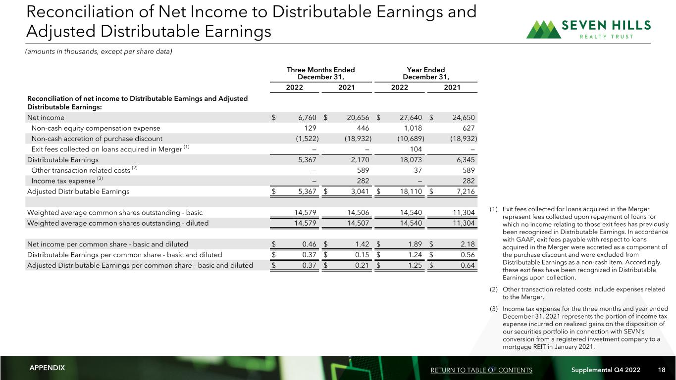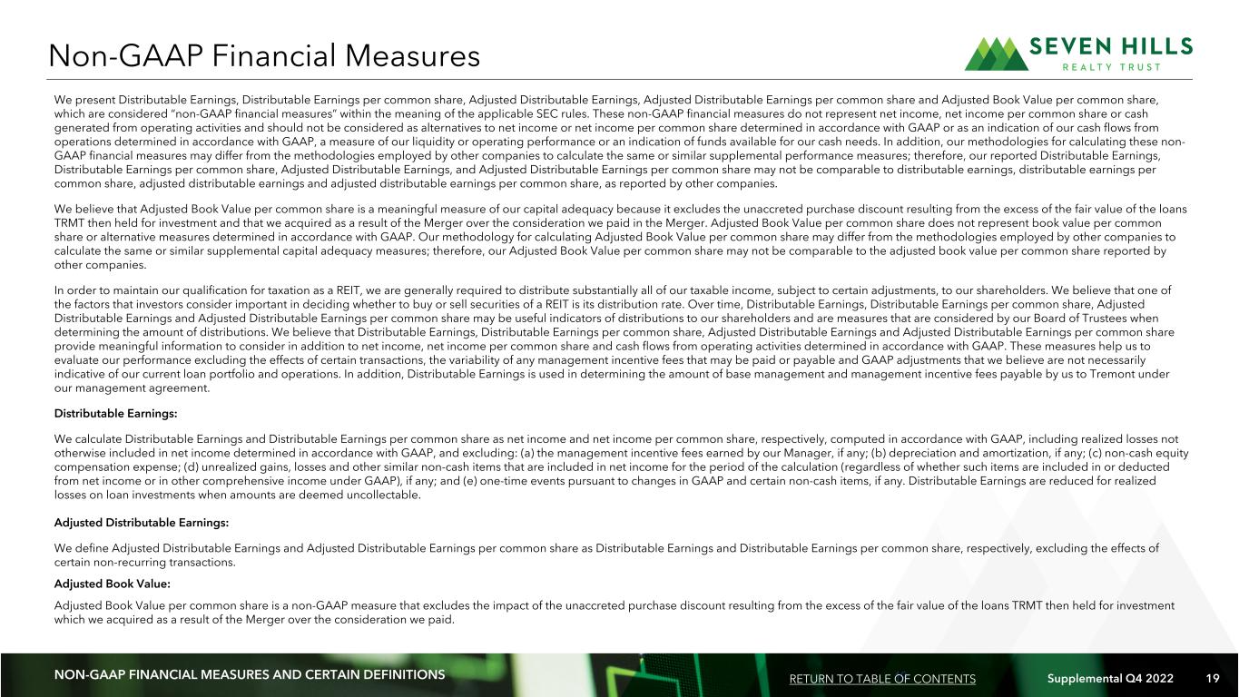 18 Supplemental Q4 2022 18 Three Months Ended December 31, Year Ended December 31, 2022 2021 2022 2021 Reconciliation of net income to Distributable Earnings and Adjusted Distributable Earnings: Net income $ 6,760 $ 20,656 $ 27,640 $ 24,650 Non-cash equity compensation expense 129 446 1,018 627 Non-cash accretion of purchase discount (1,522) (18,932) (10,689) (18,932) Exit fees collected on loans acquired in Merger (1) — — 104 — Distributable Earnings 5,367 2,170 18,073 6,345 Other transaction related costs (2) — 589 37 589 Income tax expense (3) — 282 — 282 Adjusted Distributable Earnings $ 5,367 $ 3,041 $ 18,110 $ 7,216 Weighted average common shares outstanding - basic   14,579 14,506 14,540 11,304 Weighted average common shares outstanding - diluted   14,579 14,507 14,540 11,304 Net income per common share - basic and diluted $ 0.46 $ 1.42 $ 1.89 $ 2.18 Distributable Earnings per common share - basic and diluted   $ 0.37 $ 0.15 $ 1.24 $ 0.56 Adjusted Distributable Earnings per common share - basic and diluted $ 0.37 $ 0.21 $ 1.25 $ 0.64 Reconciliation of Net Income to Distributable Earnings and Adjusted Distributable Earnings (amounts in thousands, except per share data) APPENDIX RETURN TO TABLE OF CONTENTS (1) Exit fees collected for loans acquired in the Merger represent fees collected upon repayment of loans for which no income relating to those exit fees has previously been recognized in Distributable Earnings. In accordance with GAAP, exit fees payable with respect to loans acquired in the Merger were accreted as a component of the purchase discount and were excluded from Distributable Earnings as a non-cash item. Accordingly, these exit fees have been recognized in Distributable Earnings upon collection. (2) Other transaction related costs include expenses related to the Merger. (3) Income tax expense for the three months and year ended December 31, 2021 represents the portion of income tax expense incurred on realized gains on the disposition of our securities portfolio in connection with SEVN's conversion from a registered investment company to a mortgage REIT in January 2021.