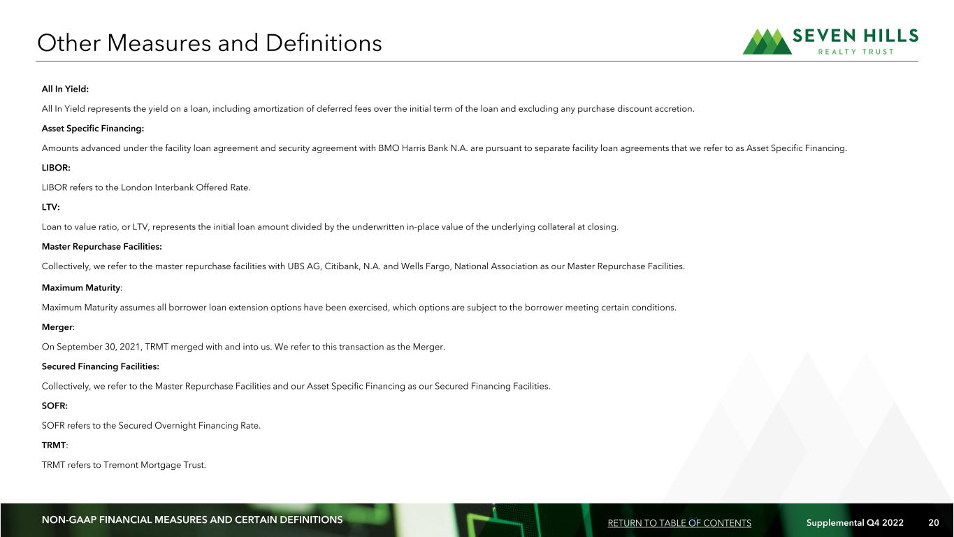 19 Supplemental Q4 2022 19 ON -G AA P FI NA NC IA L ME AS UR ES A ND C ER TA IN D EF IN IT IO NS We present Distributable Earnings, Distributable Earnings per common share, Adjusted Distributable Earnings, Adjusted Distributable Earnings per common share and Adjusted Book Value per common share, which are considered “non-GAAP financial measures” within the meaning of the applicable SEC rules. These non-GAAP financial measures do not represent net income, net income per common share or cash generated from operating activities and should not be considered as alternatives to net income or net income per common share determined in accordance with GAAP or as an indication of our cash flows from operations determined in accordance with GAAP, a measure of our liquidity or operating performance or an indication of funds available for our cash needs. In addition, our methodologies for calculating these non- GAAP financial measures may differ from the methodologies employed by other companies to calculate the same or similar supplemental performance measures; therefore, our reported Distributable Earnings, Distributable Earnings per common share, Adjusted Distributable Earnings, and Adjusted Distributable Earnings per common share may not be comparable to distributable earnings, distributable earnings per common share, adjusted distributable earnings and adjusted distributable earnings per common share, as reported by other companies. We believe that Adjusted Book Value per common share is a meaningful measure of our capital adequacy because it excludes the unaccreted purchase discount resulting from the excess of the fair value of the loans TRMT then held for investment and that we acquired as a result of the Merger over the consideration we paid in the Merger. Adjusted Book Value per common share does not represent book value per common share or alternative measures determined in accordance with GAAP. Our methodology for calculating Adjusted Book Value per common share may differ from the methodologies employed by other companies to calculate the same or similar supplemental capital adequacy measures; therefore, our Adjusted Book Value per common share may not be comparable to the adjusted book value per common share reported by other companies. In order to maintain our qualification for taxation as a REIT, we are generally required to distribute substantially all of our taxable income, subject to certain adjustments, to our shareholders. We believe that one of the factors that investors consider important in deciding whether to buy or sell securities of a REIT is its distribution rate. Over time, Distributable Earnings, Distributable Earnings per common share, Adjusted Distributable Earnings and Adjusted Distributable Earnings per common share may be useful indicators of distributions to our shareholders and are measures that are considered by our Board of Trustees when determining the amount of distributions. We believe that Distributable Earnings, Distributable Earnings per common share, Adjusted Distributable Earnings and Adjusted Distributable Earnings per common share provide meaningful information to consider in addition to net income, net income per common share and cash flows from operating activities determined in accordance with GAAP. These measures help us to evaluate our performance excluding the effects of certain transactions, the variability of any management incentive fees that may be paid or payable and GAAP adjustments that we believe are not necessarily indicative of our current loan portfolio and operations. In addition, Distributable Earnings is used in determining the amount of base management and management incentive fees payable by us to Tremont under our management agreement. Distributable Earnings: We calculate Distributable Earnings and Distributable Earnings per common share as net income and net income per common share, respectively, computed in accordance with GAAP, including realized losses not otherwise included in net income determined in accordance with GAAP, and excluding: (a) the management incentive fees earned by our Manager, if any; (b) depreciation and amortization, if any; (c) non-cash equity compensation expense; (d) unrealized gains, losses and other similar non-cash items that are included in net income for the period of the calculation (regardless of whether such items are included in or deducted from net income or in other comprehensive income under GAAP), if any; and (e) one-time events pursuant to changes in GAAP and certain non-cash items, if any. Distributable Earnings are reduced for realized losses on loan investments when amounts are deemed uncollectable. Adjusted Distributable Earnings: We define Adjusted Distributable Earnings and Adjusted Distributable Earnings per common share as Distributable Earnings and Distributable Earnings per common share, respectively, excluding the effects of certain non-recurring transactions. Adjusted Book Value: Adjusted Book Value per common share is a non-GAAP measure that excludes the impact of the unaccreted purchase discount resulting from the excess of the fair value of the loans TRMT then held for investment which we acquired as a result of the Merger over the consideration we paid. Non-GAAP Financial Measures NON-GAAP FINANCIAL MEASURES AND CERTAIN DEFINITIONS RETURN TO TABLE OF CONTENTS