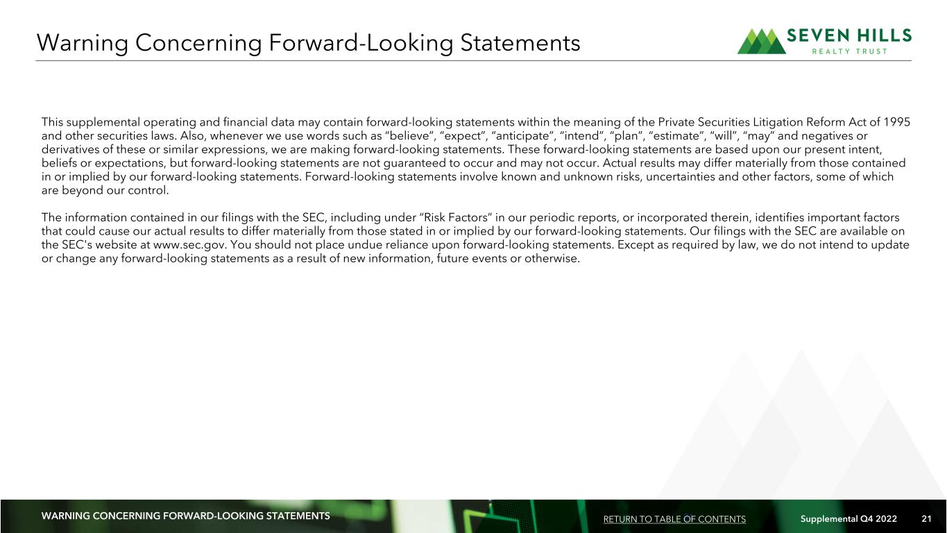 20 Supplemental Q4 2022 20 ON -G AA P FI NA NC IA L ME AS UR ES A ND C ER TA IN D EF IN IT IO NS All In Yield: All In Yield represents the yield on a loan, including amortization of deferred fees over the initial term of the loan and excluding any purchase discount accretion. Asset Specific Financing: Amounts advanced under the facility loan agreement and security agreement with BMO Harris Bank N.A. are pursuant to separate facility loan agreements that we refer to as Asset Specific Financing. LIBOR: LIBOR refers to the London Interbank Offered Rate. LTV: Loan to value ratio, or LTV, represents the initial loan amount divided by the underwritten in-place value of the underlying collateral at closing. Master Repurchase Facilities: Collectively, we refer to the master repurchase facilities with UBS AG, Citibank, N.A. and Wells Fargo, National Association as our Master Repurchase Facilities. Maximum Maturity: Maximum Maturity assumes all borrower loan extension options have been exercised, which options are subject to the borrower meeting certain conditions. Merger: On September 30, 2021, TRMT merged with and into us. We refer to this transaction as the Merger. Secured Financing Facilities: Collectively, we refer to the Master Repurchase Facilities and our Asset Specific Financing as our Secured Financing Facilities. SOFR: SOFR refers to the Secured Overnight Financing Rate. TRMT: TRMT refers to Tremont Mortgage Trust. Other Measures and Definitions NON-GAAP FINANCIAL MEASURES AND CERTAIN DEFINITIONS RETURN TO TABLE OF CONTENTS