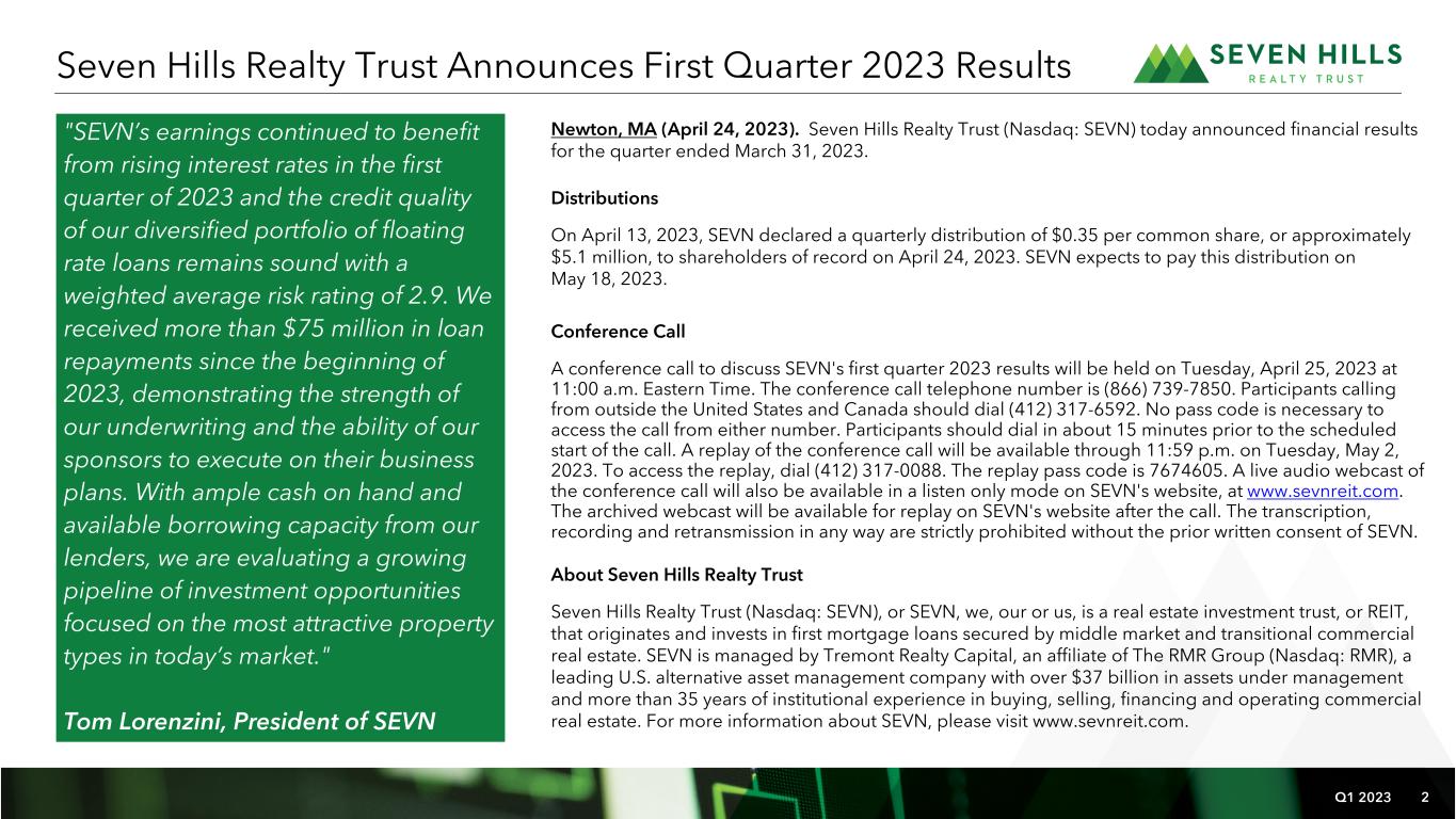 Q1 2023 2 Seven Hills Realty Trust Announces First Quarter 2023 Results "SEVN’s earnings continued to benefit from rising interest rates in the first quarter of 2023 and the credit quality of our diversified portfolio of floating rate loans remains sound with a weighted average risk rating of 2.9. We received more than $75 million in loan repayments since the beginning of 2023, demonstrating the strength of our underwriting and the ability of our sponsors to execute on their business plans. With ample cash on hand and available borrowing capacity from our lenders, we are evaluating a growing pipeline of investment opportunities focused on the most attractive property types in today’s market." Tom Lorenzini, President of SEVN Conference Call A conference call to discuss SEVN's first quarter 2023 results will be held on Tuesday, April 25, 2023 at 11:00 a.m. Eastern Time. The conference call telephone number is (866) 739-7850. Participants calling from outside the United States and Canada should dial (412) 317-6592. No pass code is necessary to access the call from either number. Participants should dial in about 15 minutes prior to the scheduled start of the call. A replay of the conference call will be available through 11:59 p.m. on Tuesday, May 2, 2023. To access the replay, dial (412) 317-0088. The replay pass code is 7674605. A live audio webcast of the conference call will also be available in a listen only mode on SEVN's website, at www.sevnreit.com. The archived webcast will be available for replay on SEVN's website after the call. The transcription, recording and retransmission in any way are strictly prohibited without the prior written consent of SEVN. Distributions On April 13, 2023, SEVN declared a quarterly distribution of $0.35 per common share, or approximately $5.1 million, to shareholders of record on April 24, 2023. SEVN expects to pay this distribution on May 18, 2023. About Seven Hills Realty Trust Seven Hills Realty Trust (Nasdaq: SEVN), or SEVN, we, our or us, is a real estate investment trust, or REIT, that originates and invests in first mortgage loans secured by middle market and transitional commercial real estate. SEVN is managed by Tremont Realty Capital, an affiliate of The RMR Group (Nasdaq: RMR), a leading U.S. alternative asset management company with over $37 billion in assets under management and more than 35 years of institutional experience in buying, selling, financing and operating commercial real estate. For more information about SEVN, please visit www.sevnreit.com. Newton, MA (April 24, 2023). Seven Hills Realty Trust (Nasdaq: SEVN) today announced financial results for the quarter ended March 31, 2023.