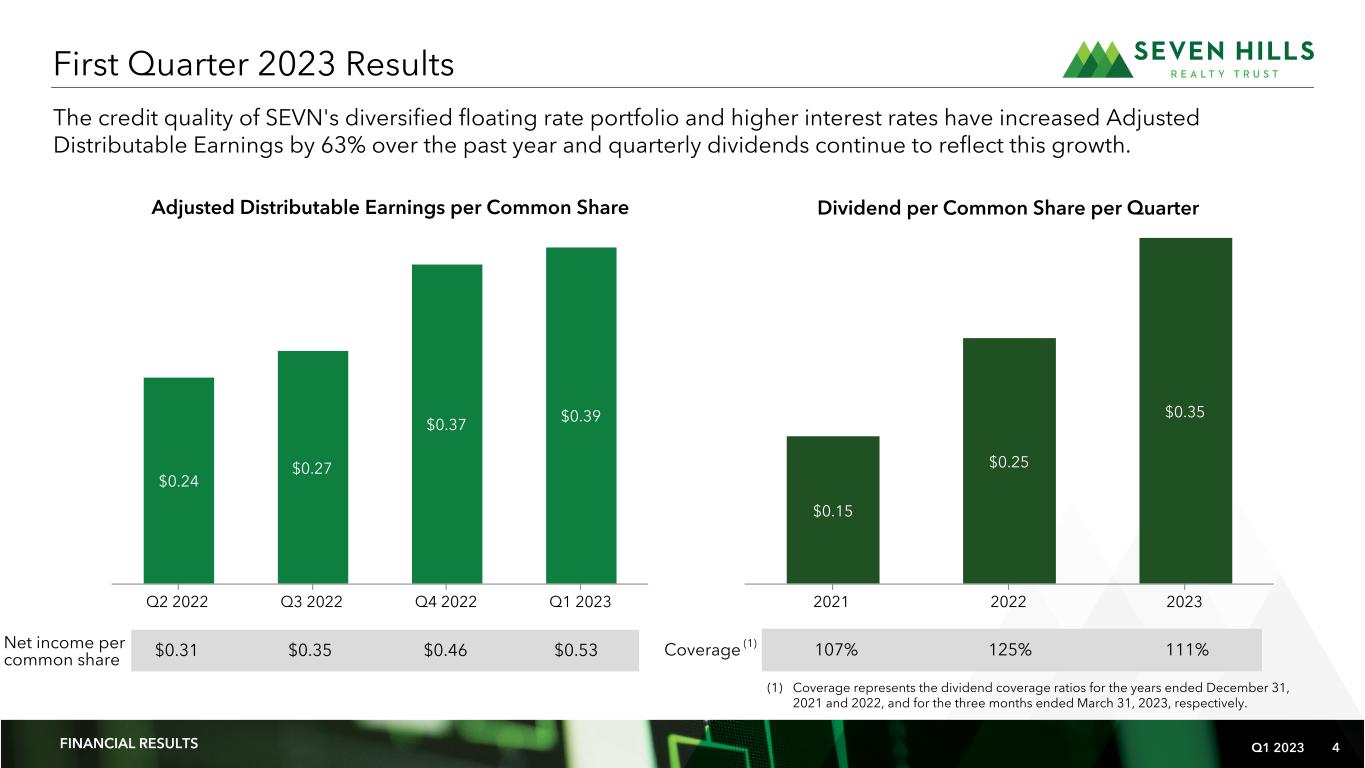 Q1 2023 3 Financial Results Investment Activity Portfolio Liquidity & Capitalization • Generated net income of $7.8 million, or $0.53 per diluted share, and Adjusted Distributable Earnings of $5.8 million, or $0.39 per diluted share. • Quarterly distribution of $0.35 per common share, declared and paid during the quarter. • Portfolio of 25 first mortgage loans with an aggregate total loan commitment of $674.5 million. • Weighted average coupon rate of 8.57% and all in yield of 9.06%. • All loans current on debt service and credit quality remains strong at a weighted average risk rating of 2.9. • Received $51.4 million of early repayment proceeds on two loans, including one loan secured by an office/industrial property in Aurora, IL with an original maturity of December 2023 and one loan secured by an industrial property in Summerville, SC with an original maturity of December 2024. • In April 2023, SEVN executed a loan application for a total potential commitment of $37.5 million to refinance a student housing property located in Auburn, AL. • Unused capacity of $246.5 million available under our Secured Financing Facilities and $84.3 million of cash on hand. • Outstanding principal balance of $435.5 million under our Secured Financing Facilities. • Weighted average coupon rate of 6.76%. • Debt to equity ratio of 1.6x as of March 31, 2023. First Quarter 2023 Highlights (As of and for the three months ended March 31, 2023, unless otherwise noted) Please refer to Non-GAAP Financial Measures and Other Measures and Definitions within the Appendix for terms used throughout this document. All amounts in this presentation are unaudited.