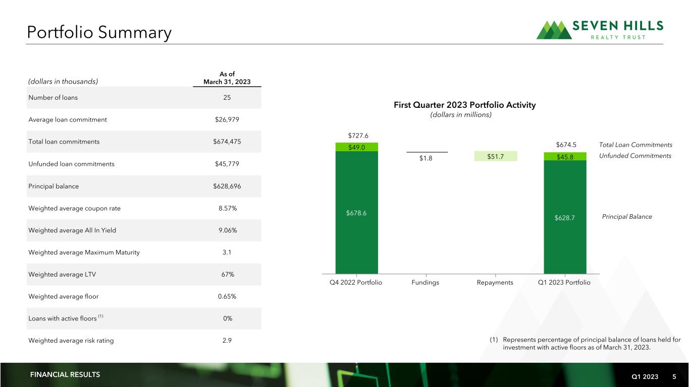 Q1 2023 4 Adjusted Distributable Earnings per Common Share $0.24 $0.27 $0.37 $0.39 Q2 2022 Q3 2022 Q4 2022 Q1 2023 FINANCIAL RESULTS First Quarter 2023 Results Net income per common share $0.31 $0.35 $0.46 $0.53 The credit quality of SEVN's diversified floating rate portfolio and higher interest rates have increased Adjusted Distributable Earnings by 63% over the past year and quarterly dividends continue to reflect this growth. Dividend per Common Share per Quarter $0.15 $0.25 $0.35 2021 2022 2023 Coverage (1) 107% 125% 111% (1) Coverage represents the dividend coverage ratios for the years ended December 31, 2021 and 2022, and for the three months ended March 31, 2023, respectively.