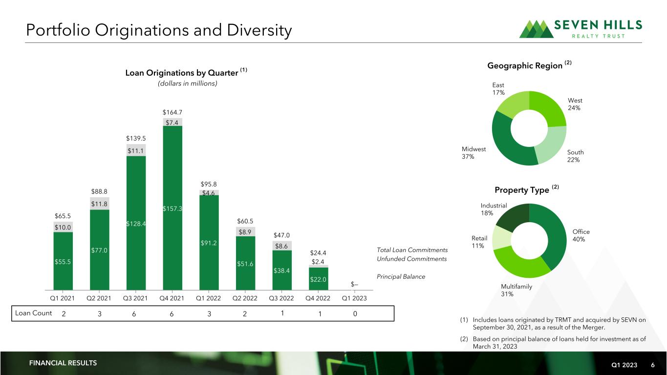 Q1 2023 5 $678.6 $678.6 $626.7 $628.7 $1.8 $51.7 $49.0 $45.8 Q4 2022 Portfolio Fundings Repayments Q1 2023 Portfolio First Quarter 2023 Portfolio Activity (dollars in millions) Total Loan Commitments (dollars in thousands) As of March 31, 2023 Number of loans 25 Average loan commitment $26,979 Total loan commitments $674,475 Unfunded loan commitments $45,779 Principal balance $628,696 Weighted average coupon rate 8.57% Weighted average All In Yield 9.06% Weighted average Maximum Maturity 3.1 Weighted average LTV 67% Weighted average floor 0.65% Loans with active floors (1) 0% Weighted average risk rating 2.9 Principal Balance Portfolio Summary FINANCIAL RESULTS $727.6 $674.5 Unfunded Commitments (1) Represents percentage of principal balance of loans held for investment with active floors as of March 31, 2023.