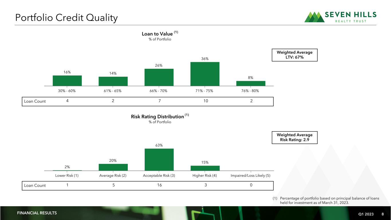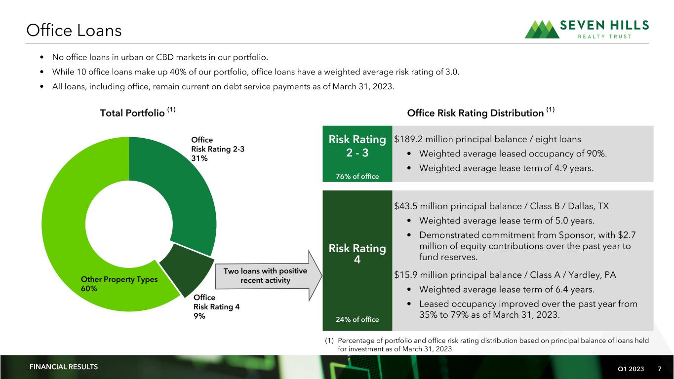 Q1 2023 6 Retail West 24% South 22% Midwest 37% East 17% Office 40% Multifamily 31% Retail 11% Industrial 18% Geographic Region (2) Property Type (2) (dollars in millions) Portfolio Originations and Diversity (1) Includes loans originated by TRMT and acquired by SEVN on September 30, 2021, as a result of the Merger. (2) Based on principal balance of loans held for investment as of March 31, 2023 $55.5 $77.0 $128.4 $157.3 $91.2 $51.6 $38.4 $22.0 $— $10.0 $11.8 $11.1 $7.4 $4.6 $8.9 $8.6 $2.4 $65.5 $88.8 $139.5 $164.7 $95.8 $60.5 $47.0 $24.4 $— Q1 2021 Q2 2021 Q3 2021 Q4 2021 Q1 2022 Q2 2022 Q3 2022 Q4 2022 Q1 2023 Total Loan Commitments Unfunded Commitments Principal Balance Loan Originations by Quarter (1) FINANCIAL RESULTS Loan Count 3 3 2 1 16 62 0