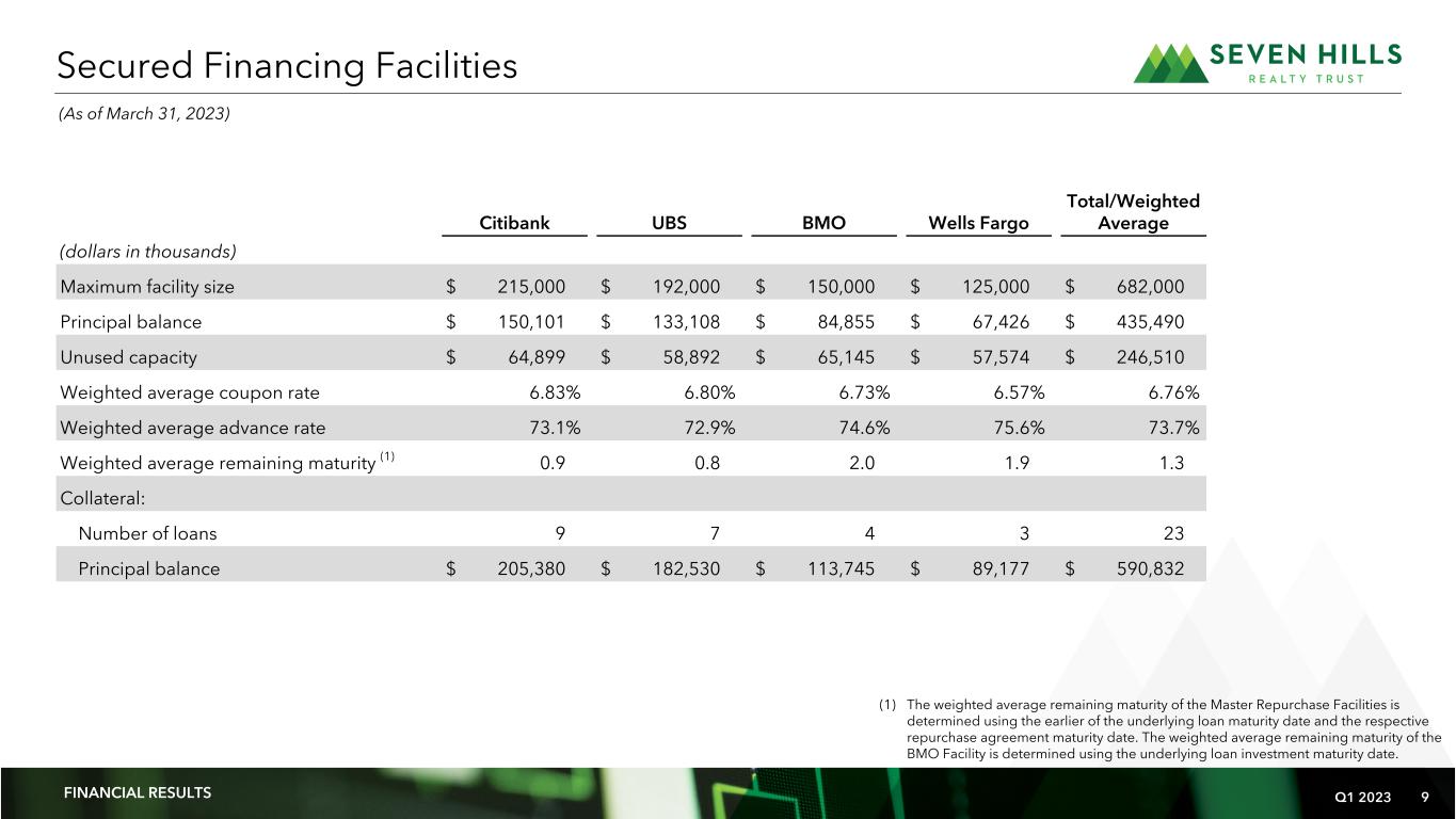 Q1 2023 8 Loan Count 16% 14% 26% 36% 8% 30% - 60% 61% - 65% 66% - 70% 71% - 75% 76% - 80% Loan to Value (1) % of Portfolio Portfolio Credit Quality Loan Count 4 2 7 10 2 1 5 16 3 0 2% 20% 63% 15% Lower Risk (1) Average Risk (2) Acceptable Risk (3) Higher Risk (4) Impaired/Loss Likely (5) Risk Rating Distribution (1) % of Portfolio Weighted Average LTV: 67% Weighted Average Risk Rating: 2.9 (1) Percentage of portfolio based on principal balance of loans held for investment as of March 31, 2023. FINANCIAL RESULTS