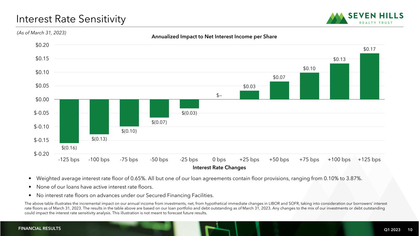 Q1 2023 9 (1) The weighted average remaining maturity of the Master Repurchase Facilities is determined using the earlier of the underlying loan maturity date and the respective repurchase agreement maturity date. The weighted average remaining maturity of the BMO Facility is determined using the underlying loan investment maturity date. Secured Financing Facilities RETURN TO TABLE OF CONTENTS FINANCIAL RESULTS (As of March 31, 2023) Citibank UBS BMO Wells Fargo Total/Weighted Average (dollars in thousands) Maximum facility size $ 215,000 $ 192,000 $ 150,000 $ 125,000 $ 682,000 Principal balance $ 150,101 $ 133,108 $ 84,855 $ 67,426 $ 435,490 Unused capacity $ 64,899 $ 58,892 $ 65,145 $ 57,574 $ 246,510 Weighted average coupon rate 6.83% 6.80% 6.73% 6.57% 6.76% Weighted average advance rate 73.1% 72.9% 74.6% 75.6% 73.7% Weighted average remaining maturity (1) 0.9 0.8 2.0 1.9 1.3 Collateral: Number of loans 9 7 4 3 23 Principal balance $ 205,380 $ 182,530 $ 113,745 $ 89,177 $ 590,832