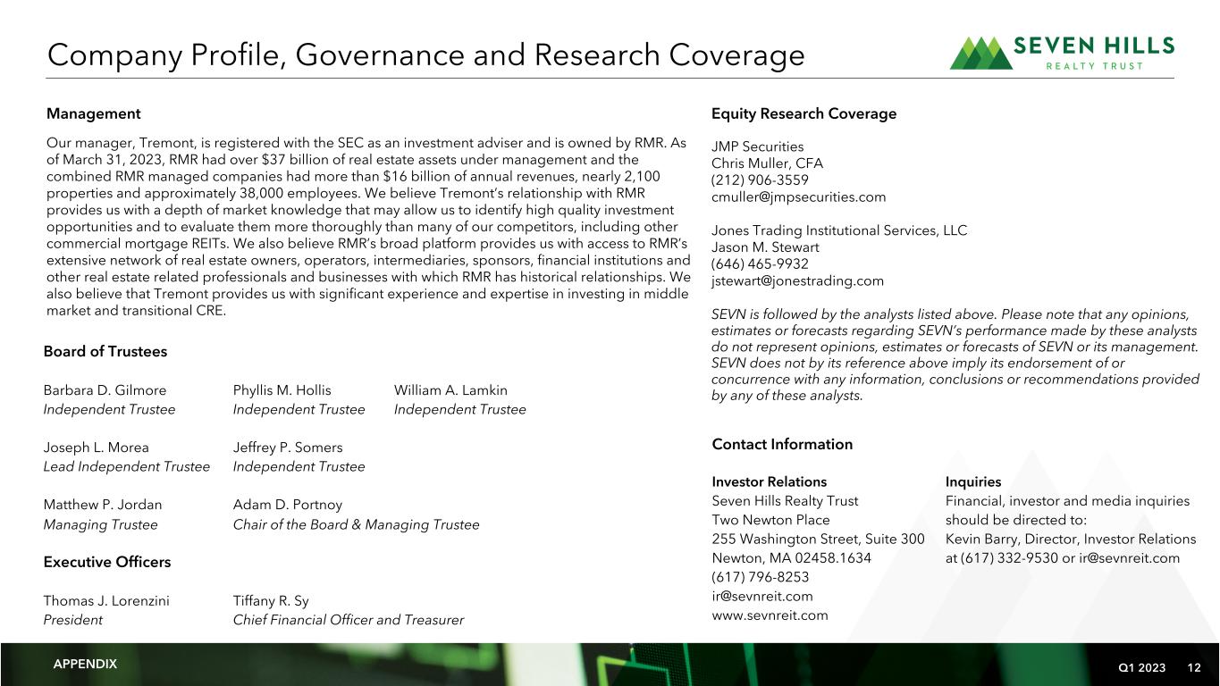 Q1 2023 12 Management Our manager, Tremont, is registered with the SEC as an investment adviser and is owned by RMR. As of March 31, 2023, RMR had over $37 billion of real estate assets under management and the combined RMR managed companies had more than $16 billion of annual revenues, nearly 2,100 properties and approximately 38,000 employees. We believe Tremont’s relationship with RMR provides us with a depth of market knowledge that may allow us to identify high quality investment opportunities and to evaluate them more thoroughly than many of our competitors, including other commercial mortgage REITs. We also believe RMR’s broad platform provides us with access to RMR’s extensive network of real estate owners, operators, intermediaries, sponsors, financial institutions and other real estate related professionals and businesses with which RMR has historical relationships. We also believe that Tremont provides us with significant experience and expertise in investing in middle market and transitional CRE. Company Profile, Governance and Research Coverage APPENDIX Equity Research Coverage JMP Securities Chris Muller, CFA (212) 906-3559 cmuller@jmpsecurities.com Jones Trading Institutional Services, LLC Jason M. Stewart (646) 465-9932 jstewart@jonestrading.com SEVN is followed by the analysts listed above. Please note that any opinions, estimates or forecasts regarding SEVN’s performance made by these analysts do not represent opinions, estimates or forecasts of SEVN or its management. SEVN does not by its reference above imply its endorsement of or concurrence with any information, conclusions or recommendations provided by any of these analysts. Board of Trustees Barbara D. Gilmore Phyllis M. Hollis William A. Lamkin Independent Trustee Independent Trustee Independent Trustee Joseph L. Morea Jeffrey P. Somers Lead Independent Trustee Independent Trustee Matthew P. Jordan Adam D. Portnoy Managing Trustee Chair of the Board & Managing Trustee Executive Officers Thomas J. Lorenzini Tiffany R. Sy President Chief Financial Officer and Treasurer Contact Information Investor Relations Inquiries Seven Hills Realty Trust Financial, investor and media inquiries Two Newton Place should be directed to: 255 Washington Street, Suite 300 Kevin Barry, Director, Investor Relations Newton, MA 02458.1634 at (617) 332-9530 or ir@sevnreit.com (617) 796-8253 ir@sevnreit.com www.sevnreit.com