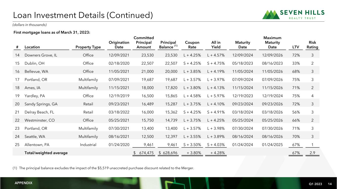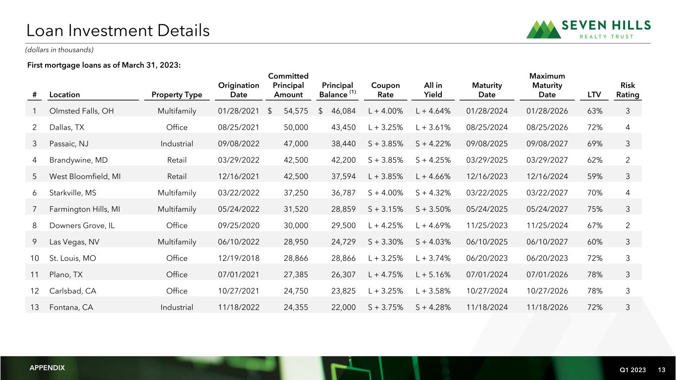 Q1 2023 13 First mortgage loans as of March 31, 2023: # Location Property Type Origination Date Committed Principal Amount Principal Balance (1) Coupon Rate All in Yield Maturity Date Maximum Maturity Date LTV Risk Rating 1 Olmsted Falls, OH Multifamily 01/28/2021 $ 54,575 $ 46,084 L + 4.00% L + 4.64% 01/28/2024 01/28/2026 63% 3 2 Dallas, TX Office 08/25/2021 50,000 43,450 L + 3.25% L + 3.61% 08/25/2024 08/25/2026 72% 4 3 Passaic, NJ Industrial 09/08/2022 47,000 38,440 S + 3.85% S + 4.22% 09/08/2025 09/08/2027 69% 3 4 Brandywine, MD Retail 03/29/2022 42,500 42,200 S + 3.85% S + 4.25% 03/29/2025 03/29/2027 62% 2 5 West Bloomfield, MI Retail 12/16/2021 42,500 37,594 L + 3.85% L + 4.66% 12/16/2023 12/16/2024 59% 3 6 Starkville, MS Multifamily 03/22/2022 37,250 36,787 S + 4.00% S + 4.32% 03/22/2025 03/22/2027 70% 4 7 Farmington Hills, MI Multifamily 05/24/2022 31,520 28,859 S + 3.15% S + 3.50% 05/24/2025 05/24/2027 75% 3 8 Downers Grove, IL Office 09/25/2020 30,000 29,500 L + 4.25% L + 4.69% 11/25/2023 11/25/2024 67% 2 9 Las Vegas, NV Multifamily 06/10/2022 28,950 24,729 S + 3.30% S + 4.03% 06/10/2025 06/10/2027 60% 3 10 St. Louis, MO Office 12/19/2018 28,866 28,866 L + 3.25% L + 3.74% 06/20/2023 06/20/2023 72% 3 11 Plano, TX Office 07/01/2021 27,385 26,307 L + 4.75% L + 5.16% 07/01/2024 07/01/2026 78% 3 12 Carlsbad, CA Office 10/27/2021 24,750 23,825 L + 3.25% L + 3.58% 10/27/2024 10/27/2026 78% 3 13 Fontana, CA Industrial 11/18/2022 24,355 22,000 S + 3.75% S + 4.28% 11/18/2024 11/18/2026 72% 3 Loan Investment Details APPENDIX (dollars in thousands)