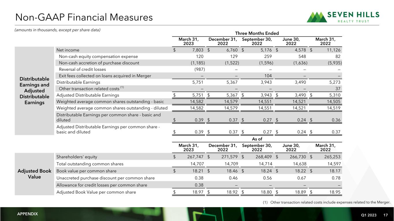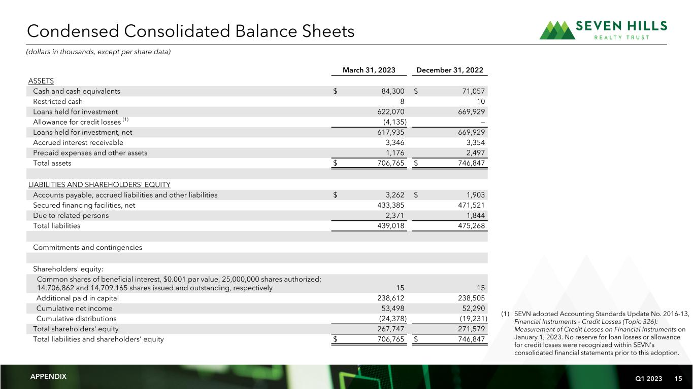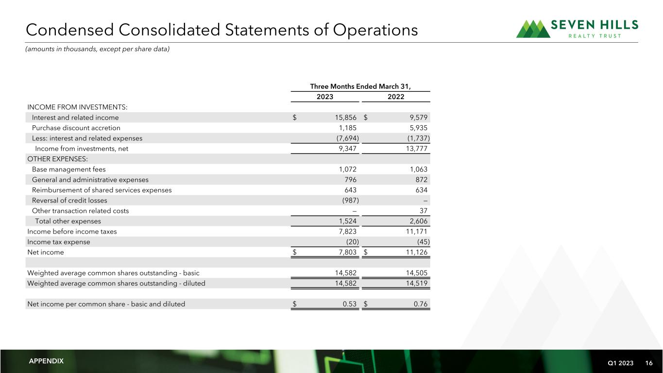 Q1 2023 15 Financial Summary March 31, 2023 December 31, 2022 ASSETS   Cash and cash equivalents $ 84,300 $ 71,057 Restricted cash 8 10 Loans held for investment 622,070 669,929 Allowance for credit losses (1) (4,135) — Loans held for investment, net 617,935 669,929 Accrued interest receivable 3,346 3,354 Prepaid expenses and other assets 1,176 2,497 Total assets $ 706,765 $ 746,847 LIABILITIES AND SHAREHOLDERS' EQUITY Accounts payable, accrued liabilities and other liabilities $ 3,262 $ 1,903 Secured financing facilities, net 433,385 471,521 Due to related persons 2,371 1,844 Total liabilities 439,018 475,268 Commitments and contingencies Shareholders' equity: Common shares of beneficial interest, $0.001 par value, 25,000,000 shares authorized; 14,706,862 and 14,709,165 shares issued and outstanding, respectively 15 15 Additional paid in capital 238,612 238,505 Cumulative net income 53,498 52,290 Cumulative distributions (24,378) (19,231) Total shareholders' equity 267,747 271,579 Total liabilities and shareholders' equity $ 706,765 $ 746,847 Condensed Consolidated Balance Sheets (dollars in thousands, except per share data) APPENDIX (1) SEVN adopted Accounting Standards Update No. 2016-13, Financial Instruments - Credit Losses (Topic 326): Measurement of Credit Losses on Financial Instruments on January 1, 2023. No reserve for loan losses or allowance for credit losses were recognized within SEVN's consolidated financial statements prior to this adoption.