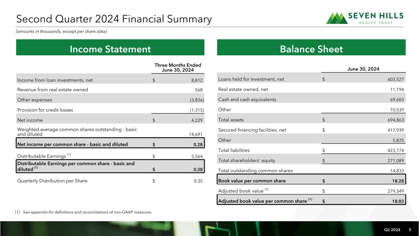 Q2 2024 4 Financial Results • Generated net income of $4.2 million, or $0.28 per diluted share and Distributable Earnings of $5.6 million, or $0.38 per diluted share. • Quarterly distribution of $0.35 per common share declared and paid during the quarter. Investment Activity • Closed two new loans during the quarter with aggregate total commitments of $41.6 million: ◦ $17.8 million loan secured by a multifamily property in Newport News, VA with a coupon of S + 3.15% and an All In Yield of S + 3.88%. ◦ $23.8 million loan secured by a self-storage facility in Los Angeles, CA with a coupon of S + 3.40% and an All In Yield of S + 3.85%. • Received $17.3 million of early repayment proceeds on a loan secured by a hotel in Scottsdale, AZ. • In July 2024, received $19.7 million of loan repayment proceeds on a loan secured by a multifamily property in Portland, OR. Portfolio • Weighted average coupon of S + 3.73% and All In Yield of S + 4.17%. • Weighted average risk rating of 3.0 and an allowance for credit losses representing 1.2% of total loan commitments. Liquidity & Capitalization • Available liquidity of $345.6 million, including unused capacity of $276.0 million available under our Secured Financing Facilities and $69.6 million of cash on hand. • Weighted average coupon of S + 2.16%. Second Quarter 2024 Highlights (As of and for the three months ended June 30, 2024, unless otherwise noted) Please refer to Non-GAAP Financial Measures and Other Measures and Definitions within the Appendix for terms used throughout this document. All amounts in this presentation are unaudited.