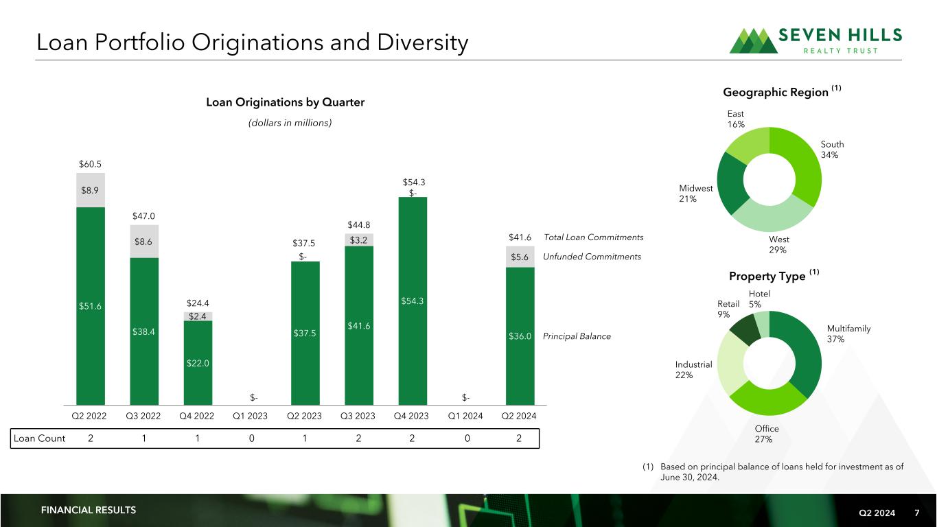 Q2 2024 6 $590.6 $590.6 $626.6 $627.5 $610.2 $36.0 $0.9 $17.3 $38.3 $5.6 $42.0 Q1 2024 Loan Portfolio Originations Fundings Repayments Q2 2024 Loan Portfolio Second Quarter 2024 Loan Portfolio Activity (dollars in millions) Total Loan Commitments (dollars in thousands) Second Quarter Originations As of June 30, 2024 Number of loans 2 22 Average loan commitment $20,779 $29,645 Total loan commitments $41,557 $652,198 Unfunded loan commitments $5,540 $41,988 Principal balance $36,017 $610,210 Weighted average coupon rate 8.64% 9.11% Weighted average All In Yield 9.20% 9.55% Weighted average Maximum Maturity 4.9 2.6 Weighted average LTV 63% 68% Weighted average floor 2.60% 1.42% Weighted average risk rating 3.0 3.0 Principal Balance Loan Portfolio Summary FINANCIAL RESULTS $628.9 Unfunded Commitments $652.2 (1) (1) In June 2024, the sponsor of the loan secured by a multifamily property in Farmington Hills, MI exercised its option to reduce the committed principal amount of the loan by $1.0 million, in accordance with the loan agreement.