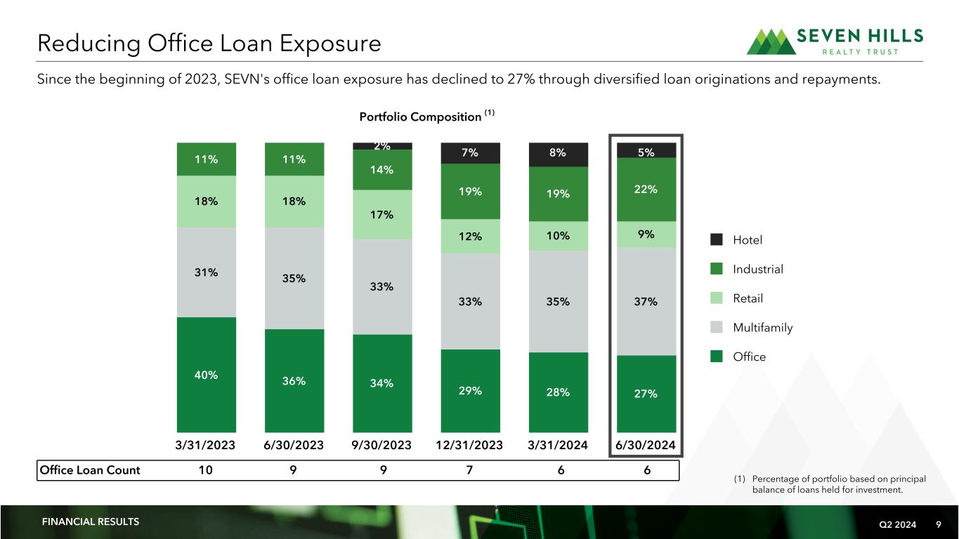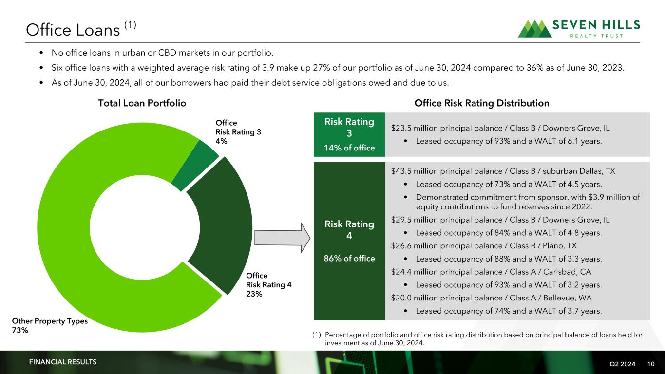Q2 2024 9 Reducing Office Loan Exposure 40% 36% 34% 29% 28% 27% 31% 35% 33% 33% 35% 37% 18% 18% 17% 12% 10% 9% 11% 11% 14% 19% 19% 22% 2% 7% 8% 5% Hotel Industrial Retail Multifamily Office 3/31/2023 6/30/2023 9/30/2023 12/31/2023 3/31/2024 6/30/2024 FINANCIAL RESULTS Office Loan Count 10 9 9 7 6 6 Since the beginning of 2023, SEVN's office loan exposure has declined to 27% through diversified loan originations and repayments. (1) Percentage of portfolio based on principal balance of loans held for investment. Portfolio Composition (1)