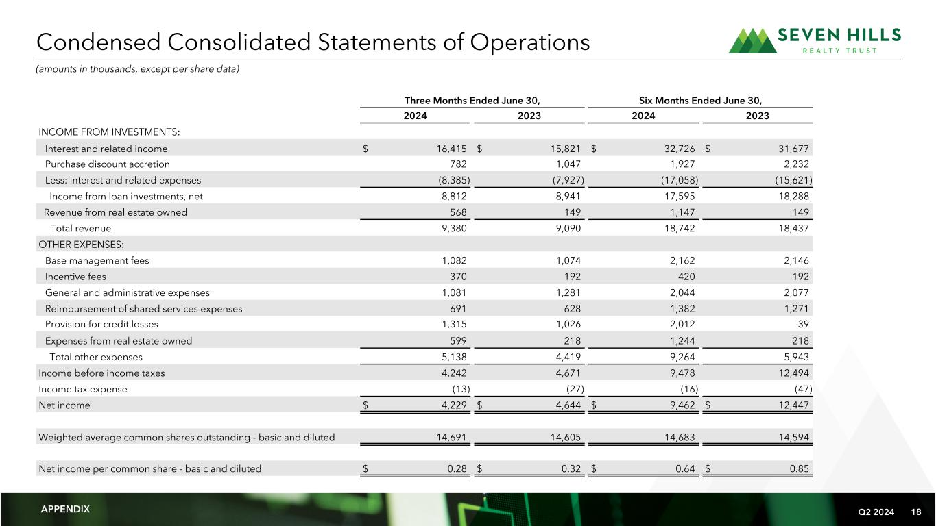 Q2 2024 18 Condensed Consolidated Statements of Operations Three Months Ended June 30, Six Months Ended June 30,     2024 2023 2024 2023 INCOME FROM INVESTMENTS:        Interest and related income  $ 16,415 $ 15,821 $ 32,726 $ 31,677 Purchase discount accretion 782 1,047 1,927 2,232 Less: interest and related expenses   (8,385) (7,927) (17,058) (15,621) Income from loan investments, net 8,812 8,941 17,595 18,288 Revenue from real estate owned   568 149 1,147 149 Total revenue 9,380 9,090 18,742 18,437 OTHER EXPENSES: Base management fees 1,082 1,074 2,162 2,146 Incentive fees 370 192 420 192 General and administrative expenses   1,081 1,281 2,044 2,077 Reimbursement of shared services expenses 691 628 1,382 1,271 Provision for credit losses 1,315 1,026 2,012 39 Expenses from real estate owned   599 218 1,244 218 Total other expenses   5,138 4,419 9,264 5,943 Income before income taxes 4,242 4,671 9,478 12,494 Income tax expense (13) (27) (16) (47) Net income  $ 4,229 $ 4,644 $ 9,462 $ 12,447   Weighted average common shares outstanding - basic and diluted   14,691 14,605 14,683 14,594   Net income per common share - basic and diluted  $ 0.28 $ 0.32 $ 0.64 $ 0.85 (amounts in thousands, except per share data) APPENDIX
