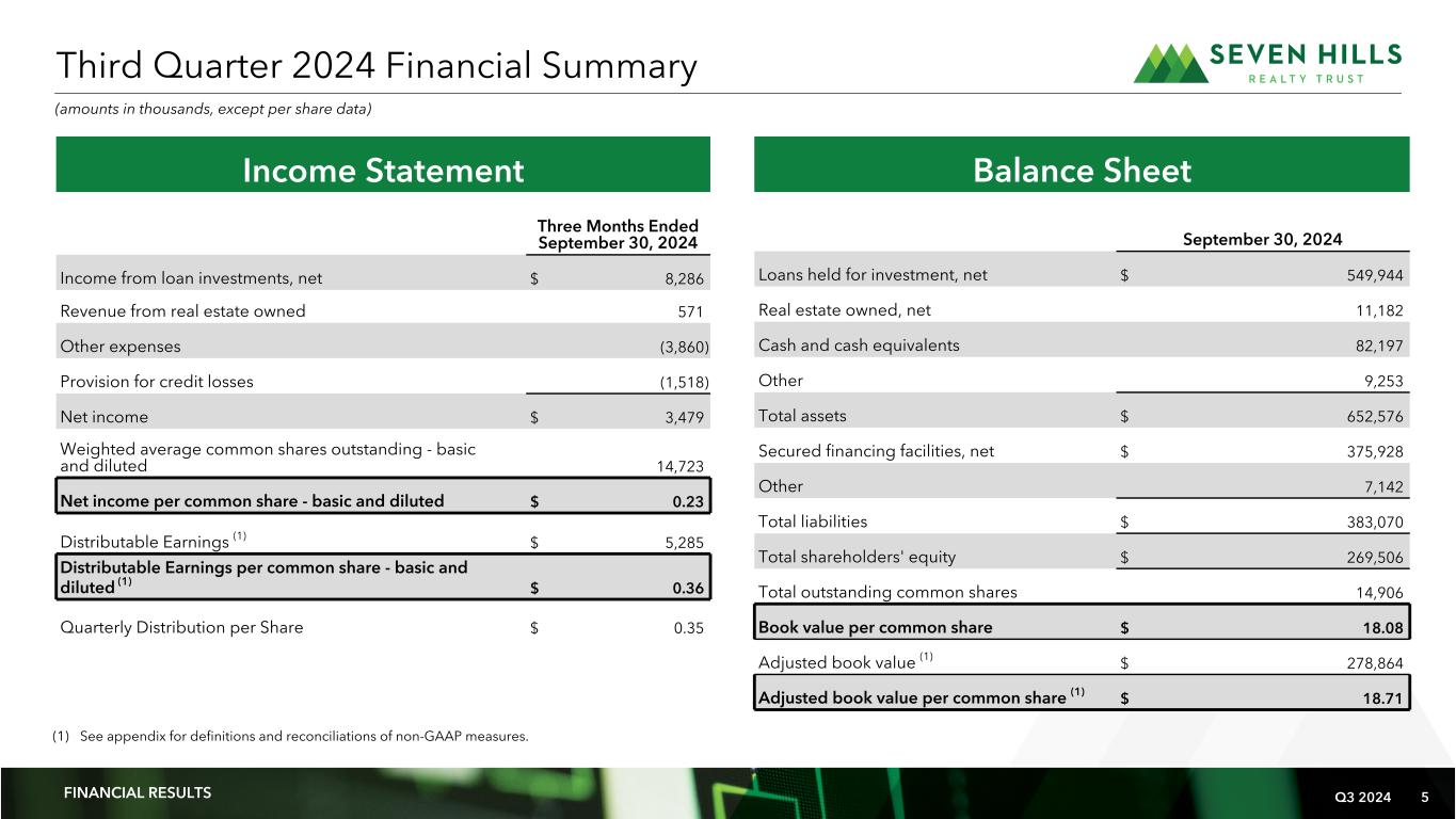 Q3 2024 4 Financial Results • Generated net income of $3.5 million, or $0.23 per diluted share and Distributable Earnings of $5.3 million, or $0.36 per diluted share. • Quarterly distribution of $0.35 per common share declared and paid during the quarter. Investment Activity • Closed one new loan secured by a hotel in Lake Mary, FL with a total commitment of $16.0 million, a coupon of S + 4.00% and an All In Yield of S + 4.42%. • Received $70.6 million of repayment proceeds: ◦ $33.1 million on two loans secured by multifamily properties in Portland, OR. ◦ $37.5 million on a loan secured by a student housing property in Auburn, AL. Portfolio • Weighted average coupon of S + 3.74% and All In Yield of S + 4.12%. • Weighted average risk rating of 3.1 and an allowance for credit losses representing 1.6% of total loan commitments. Liquidity & Capitalization • Cash on hand of $82.2 million and unused capacity of $317.7 million available under our Secured Financing Facilities. • Weighted average coupon of S + 2.15% on borrowings under our Secured Financing Facilities. • Extended the maturity date of our Citibank Master Repurchase Facility to September 2026. • In October 2024, extended the maturity date of our Wells Fargo Master Repurchase Facility to March 2026. Third Quarter 2024 Highlights (As of and for the three months ended September 30, 2024, unless otherwise noted) Please refer to Non-GAAP Financial Measures and Other Measures and Definitions within the Appendix for terms used throughout this document. All amounts in this presentation are unaudited.