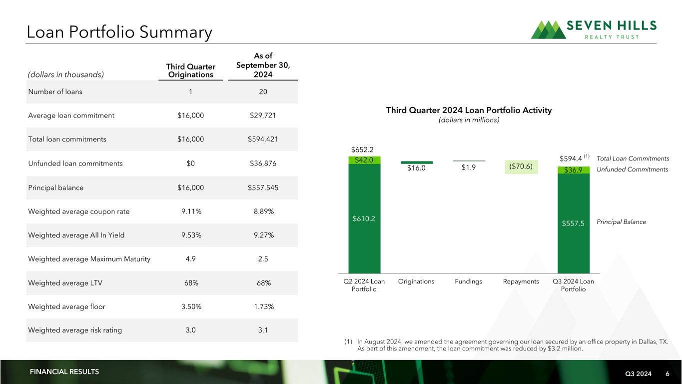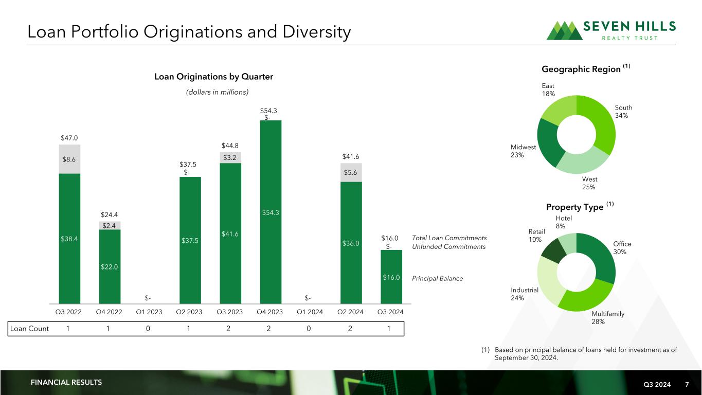 Q3 2024 6 $610.2 $610.2 $626.2 $557.5 $557.5 $16.0 $1.9 ($70.6) $42.0 $36.9 Q2 2024 Loan Portfolio Originations Fundings Repayments Q3 2024 Loan Portfolio Third Quarter 2024 Loan Portfolio Activity (dollars in millions) Total Loan Commitments (dollars in thousands) Third Quarter Originations As of September 30, 2024 Number of loans 1 20 Average loan commitment $16,000 $29,721 Total loan commitments $16,000 $594,421 Unfunded loan commitments $0 $36,876 Principal balance $16,000 $557,545 Weighted average coupon rate 9.11% 8.89% Weighted average All In Yield 9.53% 9.27% Weighted average Maximum Maturity 4.9 2.5 Weighted average LTV 68% 68% Weighted average floor 3.50% 1.73% Weighted average risk rating 3.0 3.1 Principal Balance Loan Portfolio Summary FINANCIAL RESULTS $652.2 Unfunded Commitments $594.4 (1) (1) In August 2024, we amended the agreement governing our loan secured by an office property in Dallas, TX. As part of this amendment, the loan commitment was reduced by $3.2 million.