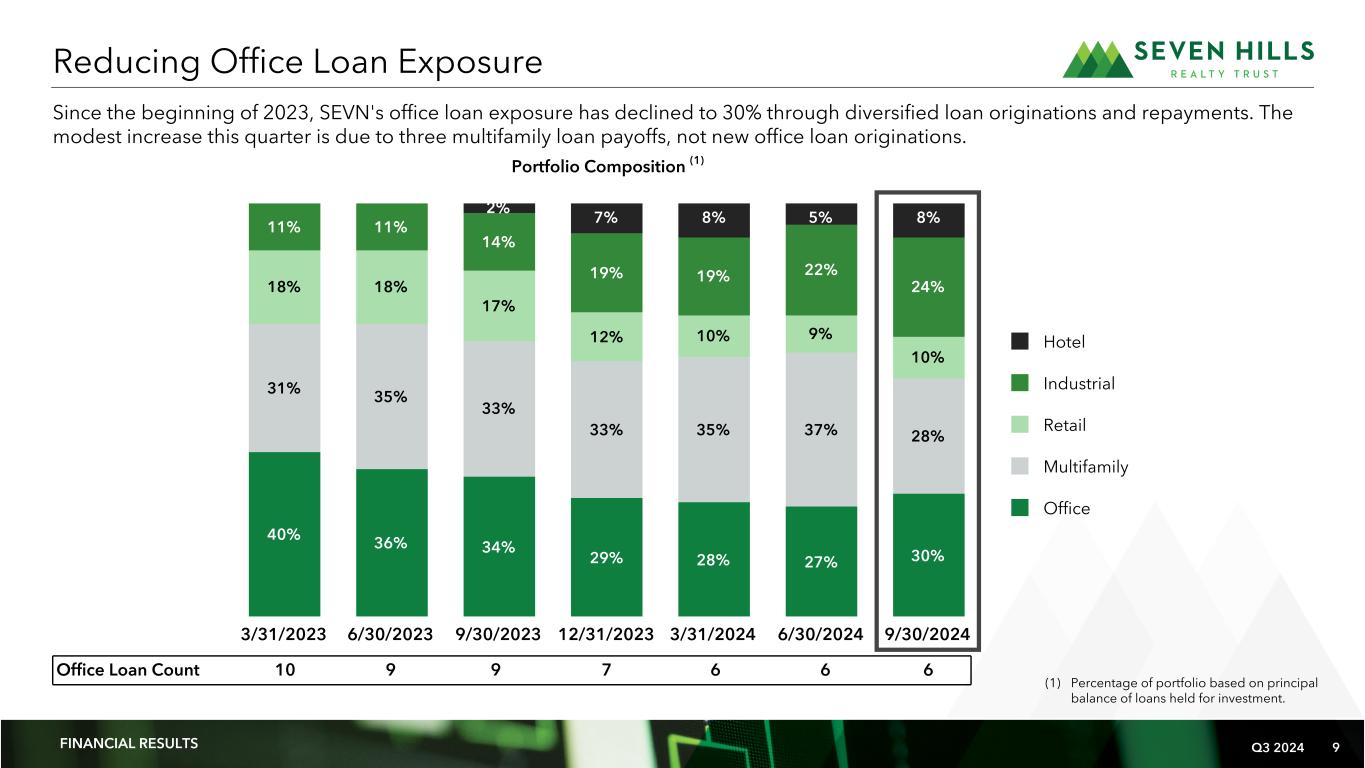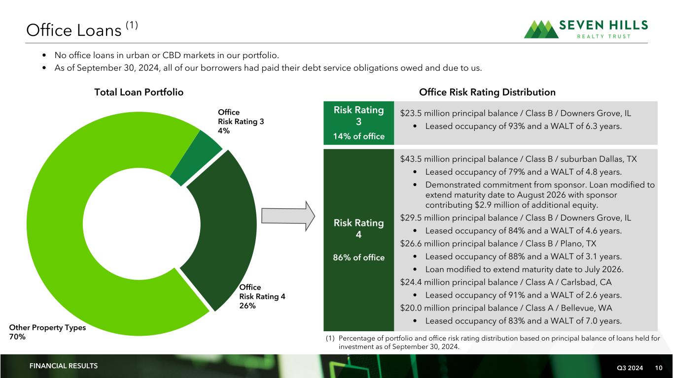 Q3 2024 9 Reducing Office Loan Exposure 40% 36% 34% 29% 28% 27% 30% 31% 35% 33% 33% 35% 37% 28% 18% 18% 17% 12% 10% 9% 10% 11% 11% 14% 19% 19% 22% 24% 2% 7% 8% 5% 8% Hotel Industrial Retail Multifamily Office 3/31/2023 6/30/2023 9/30/2023 12/31/2023 3/31/2024 6/30/2024 9/30/2024 FINANCIAL RESULTS Office Loan Count 10 9 9 7 6 6 6 Since the beginning of 2023, SEVN's office loan exposure has declined to 30% through diversified loan originations and repayments. The modest increase this quarter is due to three multifamily loan payoffs, not new office loan originations. (1) Percentage of portfolio based on principal balance of loans held for investment. Portfolio Composition (1)