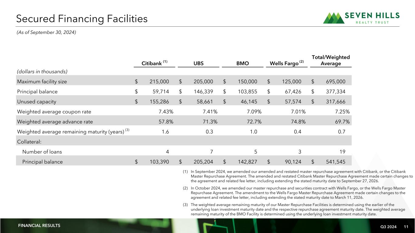 Q3 2024 11 (1) In September 2024, we amended our amended and restated master repurchase agreement with Citibank, or the Citibank Master Repurchase Agreement. The amended and restated Citibank Master Repurchase Agreement made certain changes to the agreement and related fee letter, including extending the stated maturity date to September 27, 2026. (2) In October 2024, we amended our master repurchase and securities contract with Wells Fargo, or the Wells Fargo Master Repurchase Agreement. The amendment to the Wells Fargo Master Repurchase Agreement made certain changes to the agreement and related fee letter, including extending the stated maturity date to March 11, 2026. (3) The weighted average remaining maturity of our Master Repurchase Facilities is determined using the earlier of the underlying loan investment maturity date and the respective repurchase agreement maturity date. The weighted average remaining maturity of the BMO Facility is determined using the underlying loan investment maturity date. Secured Financing Facilities FINANCIAL RESULTS (As of September 30, 2024) Citibank (1) UBS BMO Wells Fargo (2) Total/Weighted Average (dollars in thousands) Maximum facility size $ 215,000 $ 205,000 $ 150,000 $ 125,000 $ 695,000 Principal balance $ 59,714 $ 146,339 $ 103,855 $ 67,426 $ 377,334 Unused capacity $ 155,286 $ 58,661 $ 46,145 $ 57,574 $ 317,666 Weighted average coupon rate 7.43% 7.41% 7.09% 7.01% 7.25% Weighted average advance rate 57.8% 71.3% 72.7% 74.8% 69.7% Weighted average remaining maturity (years) (3) 1.6 0.3 1.0 0.4 0.7 Collateral: Number of loans 4 7 5 3 19 Principal balance $ 103,390 $ 205,204 $ 142,827 $ 90,124 $ 541,545