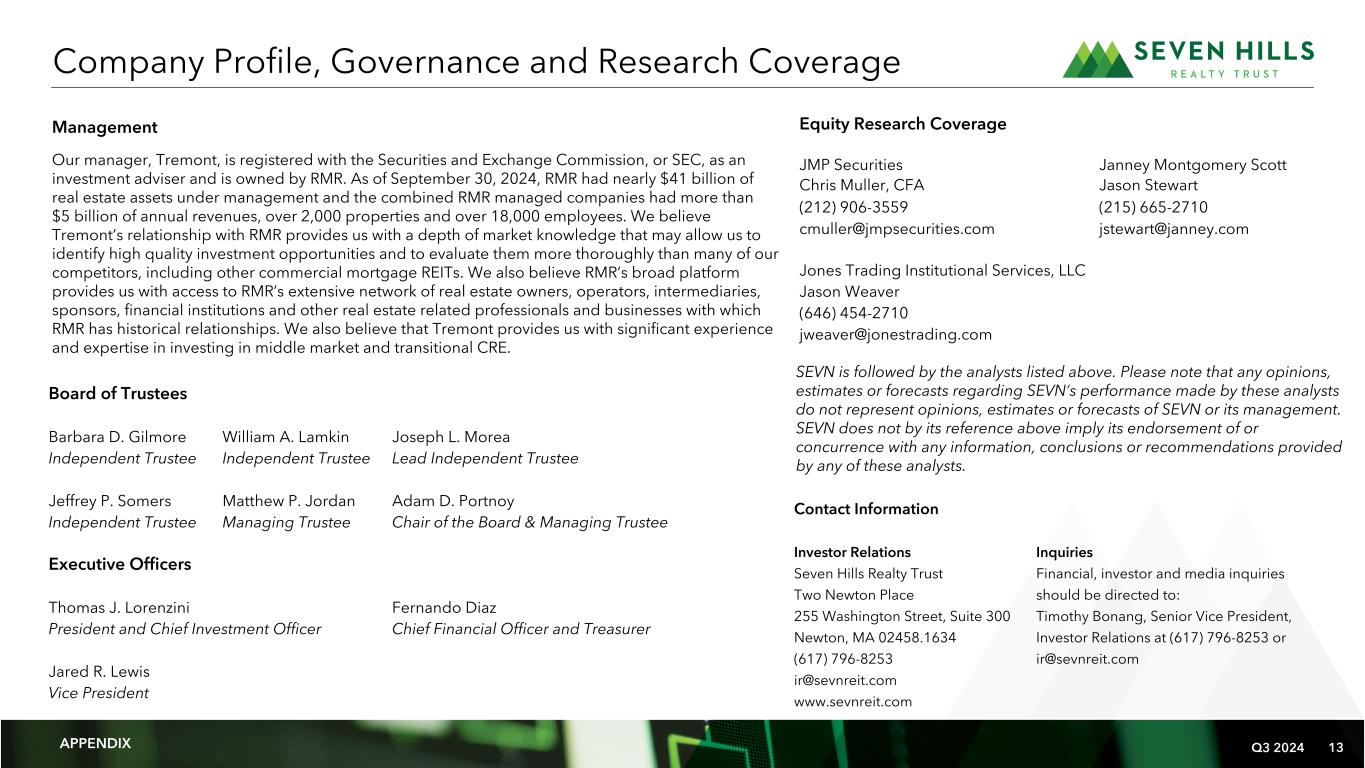 Q3 2024 13 Management Our manager, Tremont, is registered with the Securities and Exchange Commission, or SEC, as an investment adviser and is owned by RMR. As of September 30, 2024, RMR had nearly $41 billion of real estate assets under management and the combined RMR managed companies had more than $5 billion of annual revenues, over 2,000 properties and over 18,000 employees. We believe Tremont’s relationship with RMR provides us with a depth of market knowledge that may allow us to identify high quality investment opportunities and to evaluate them more thoroughly than many of our competitors, including other commercial mortgage REITs. We also believe RMR’s broad platform provides us with access to RMR’s extensive network of real estate owners, operators, intermediaries, sponsors, financial institutions and other real estate related professionals and businesses with which RMR has historical relationships. We also believe that Tremont provides us with significant experience and expertise in investing in middle market and transitional CRE. Company Profile, Governance and Research Coverage APPENDIX SEVN is followed by the analysts listed above. Please note that any opinions, estimates or forecasts regarding SEVN’s performance made by these analysts do not represent opinions, estimates or forecasts of SEVN or its management. SEVN does not by its reference above imply its endorsement of or concurrence with any information, conclusions or recommendations provided by any of these analysts. Board of Trustees Barbara D. Gilmore William A. Lamkin Joseph L. Morea Independent Trustee Independent Trustee Lead Independent Trustee Jeffrey P. Somers Matthew P. Jordan Adam D. Portnoy Independent Trustee Managing Trustee Chair of the Board & Managing Trustee Executive Officers Thomas J. Lorenzini Fernando Diaz President and Chief Investment Officer Chief Financial Officer and Treasurer Jared R. Lewis Vice President Contact Information Investor Relations Inquiries Seven Hills Realty Trust Financial, investor and media inquiries Two Newton Place should be directed to: 255 Washington Street, Suite 300 Timothy Bonang, Senior Vice President, Newton, MA 02458.1634 Investor Relations at (617) 796-8253 or (617) 796-8253 ir@sevnreit.com ir@sevnreit.com www.sevnreit.com Equity Research Coverage JMP Securities Janney Montgomery Scott Chris Muller, CFA Jason Stewart (212) 906-3559 (215) 665-2710 cmuller@jmpsecurities.com jstewart@janney.com Jones Trading Institutional Services, LLC Jason Weaver (646) 454-2710 jweaver@jonestrading.com