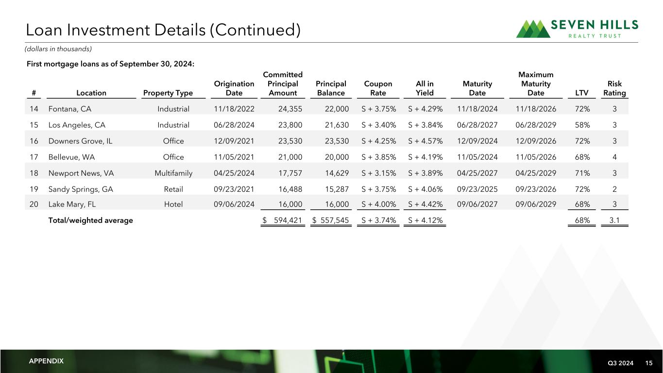 Q3 2024 14 First mortgage loans as of September 30, 2024: # Location Property Type Origination Date Committed Principal Amount Principal Balance Coupon Rate All in Yield Maturity Date Maximum Maturity Date LTV Risk Rating 1 Olmsted Falls, OH Multifamily 01/28/2021 $ 54,575 $ 46,083 S + 4.00% S + 4.33% 01/28/2025 01/28/2026 63% 3 2 Dallas, TX Office 08/25/2021 46,811 43,511 S + 3.25% S + 3.27% 08/25/2026 08/25/2026 72% 4 3 Passaic, NJ Industrial 09/08/2022 47,000 41,711 S + 3.85% S + 4.24% 09/08/2025 09/08/2027 69% 3 4 Brandywine, MD Retail 03/29/2022 42,500 42,200 S + 3.85% S + 4.27% 03/29/2025 03/29/2027 62% 3 5 Starkville, MS Multifamily 03/22/2022 37,250 37,250 S + 4.00% S + 4.33% 03/22/2025 03/22/2027 70% 2 6 Farmington Hills, MI Multifamily 05/24/2022 30,520 29,345 S + 3.15% S + 3.52% 05/24/2025 05/24/2027 75% 3 7 Downers Grove, IL Office 09/25/2020 30,000 29,500 S + 4.25% S + 4.64% 11/25/2024 11/25/2024 67% 4 8 Anaheim, CA Hotel 11/29/2023 29,000 29,000 S + 4.00% S + 4.57% 11/29/2025 11/29/2028 55% 2 9 Las Vegas, NV Multifamily 06/10/2022 28,950 25,333 S + 3.30% S + 4.08% 06/10/2025 06/10/2027 60% 3 10 Fountain Inn, SC Industrial 07/13/2023 27,500 24,300 S + 4.25% S + 4.85% 07/13/2025 07/13/2026 76% 3 11 Plano, TX Office 07/01/2021 27,385 26,569 S + 3.75% S + 3.76% 07/01/2026 07/01/2026 78% 4 12 Fayetteville, GA Industrial 10/06/2023 25,250 25,250 S + 3.35% S + 3.73% 10/06/2026 10/06/2028 55% 3 13 Carlsbad, CA (1) Office 10/27/2021 24,750 24,417 S + 3.25% S + 3.58% 10/27/2024 10/27/2026 78% 4 Loan Investment Details APPENDIX (dollars in thousands) (1) In October 2024, the maturity of this loan was extended to January 27, 2025.
