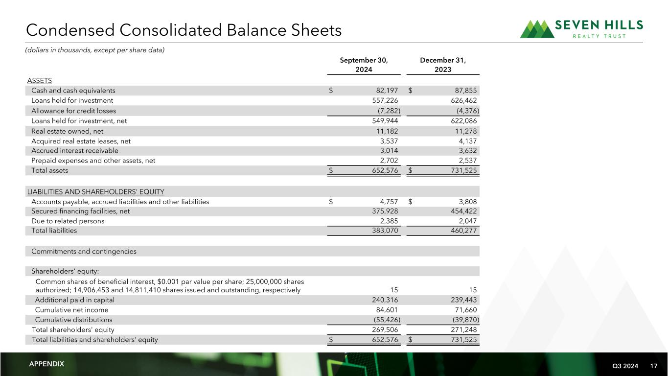 Q3 2024 17 Financial Summary September 30, December 31, 2024 2023 ASSETS Cash and cash equivalents $ 82,197 $ 87,855 Loans held for investment 557,226 626,462 Allowance for credit losses (7,282) (4,376) Loans held for investment, net 549,944 622,086 Real estate owned, net 11,182 11,278 Acquired real estate leases, net 3,537 4,137 Accrued interest receivable 3,014 3,632 Prepaid expenses and other assets, net 2,702 2,537 Total assets $ 652,576 $ 731,525 LIABILITIES AND SHAREHOLDERS' EQUITY Accounts payable, accrued liabilities and other liabilities $ 4,757 $ 3,808 Secured financing facilities, net 375,928 454,422 Due to related persons 2,385 2,047 Total liabilities 383,070 460,277 Commitments and contingencies Shareholders' equity: Common shares of beneficial interest, $0.001 par value per share; 25,000,000 shares authorized; 14,906,453 and 14,811,410 shares issued and outstanding, respectively 15 15 Additional paid in capital 240,316 239,443 Cumulative net income 84,601 71,660 Cumulative distributions (55,426) (39,870) Total shareholders' equity 269,506 271,248 Total liabilities and shareholders' equity $ 652,576 $ 731,525 Condensed Consolidated Balance Sheets (dollars in thousands, except per share data) APPENDIX