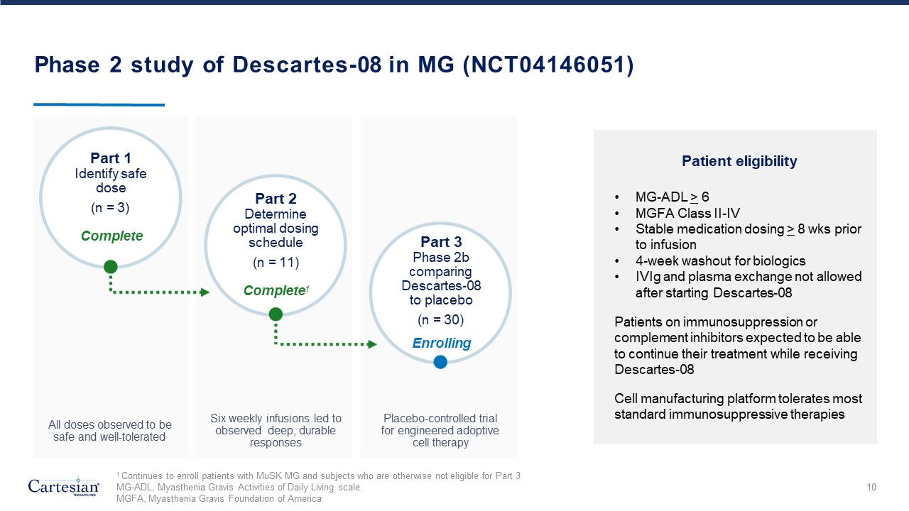 Phase 2 study of Descartes-08 in MG (NCT04146051)  All doses observed to be safe and well-tolerated  10  Patient eligibility  MG-ADL > 6  MGFA Class II-IV  Stable medication dosing > 8 wks prior to infusion  4-week washout for biologics  IVIg and plasma exchange not allowed after starting Descartes-08  Patients on immunosuppression or complement inhibitors expected to be able to continue their treatment while receiving Descartes-08  Cell manufacturing platform tolerates most standard immunosuppressive therapies  Part 1 Identify safe dose  (n = 3)  Complete  Part 2 Determine optimal dosing schedule  (n = 11)  Complete1  Part 3 Phase 2b comparing Descartes-08 to placebo  (n = 30)  Enrolling  1 Continues to enroll patients with MuSK MG and subjects who are otherwise not eligible for Part 3 MG-ADL, Myasthenia Gravis Activities of Daily Living scale  MGFA, Myasthenia Gravis Foundation of America  Six weekly infusions led to observed deep, durable responses  Placebo-controlled trial for engineered adoptive cell therapy