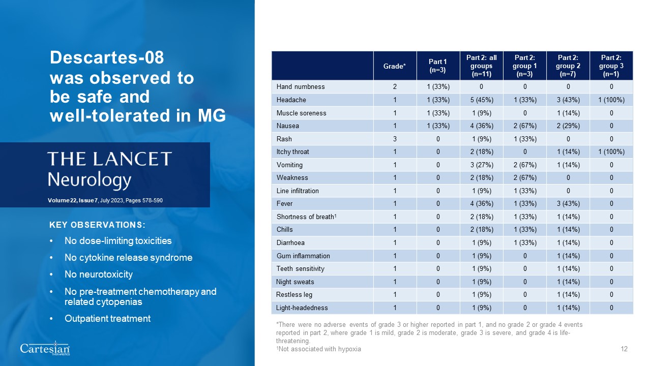 ®  THERAPEUTICS  Descartes-08  was observed to  be safe and  well-tolerated in MG  KEY OBSERVATIONS:  No dose-limiting toxicities  No cytokine release syndrome  No neurotoxicity  No pre-treatment chemotherapy and related cytopenias  Outpatient treatment  Volume 22, Issue 7, July 2023, Pages 578-590  12  Grade*  Part 1 (n=3)  Part 2: all groups (n=11)  Part 2:  group 1 (n=3)  Part 2:  group 2 (n=7)  Part 2:  group 3 (n=1)  Hand numbness  2  1 (33%)  0  0  0  0  Headache  1  1 (33%)  5 (45%)  1 (33%)  3 (43%)  1 (100%)  Muscle soreness  1  1 (33%)  1 (9%)  0  1 (14%)  0  Nausea  1  1 (33%)  4 (36%)  2 (67%)  2 (29%)  0  Rash  3  0  1 (9%)  1 (33%)  0  0  Itchy throat  1  0  2 (18%)  0  1 (14%)  1 (100%)  Vomiting  1  0  3 (27%)  2 (67%)  1 (14%)  0  Weakness  1  0  2 (18%)  2 (67%)  0  0  Line infiltration  1  0  1 (9%)  1 (33%)  0  0  Fever  1  0  4 (36%)  1 (33%)  3 (43%)  0  Shortness of breath1  1  0  2 (18%)  1 (33%)  1 (14%)  0  Chills  1  0  2 (18%)  1 (33%)  1 (14%)  0  Diarrhoea  1  0  1 (9%)  1 (33%)  1 (14%)  0  Gum inflammation  1  0  1 (9%)  0  1 (14%)  0  Teeth sensitivity  1  0  1 (9%)  0  1 (14%)  0  Night sweats  1  0  1 (9%)  0  1 (14%)  0  Restless leg  1  0  1 (9%)  0  1 (14%)  0  Light-headedness  1  0  1 (9%)  0  1 (14%)  0  *There were no adverse events of grade 3 or higher reported in part 1, and no grade 2 or grade 4 events reported in part 2, where grade 1 is mild, grade 2 is moderate, grade 3 is severe, and grade 4 is life-  threatening.  1Not associated with hypoxia