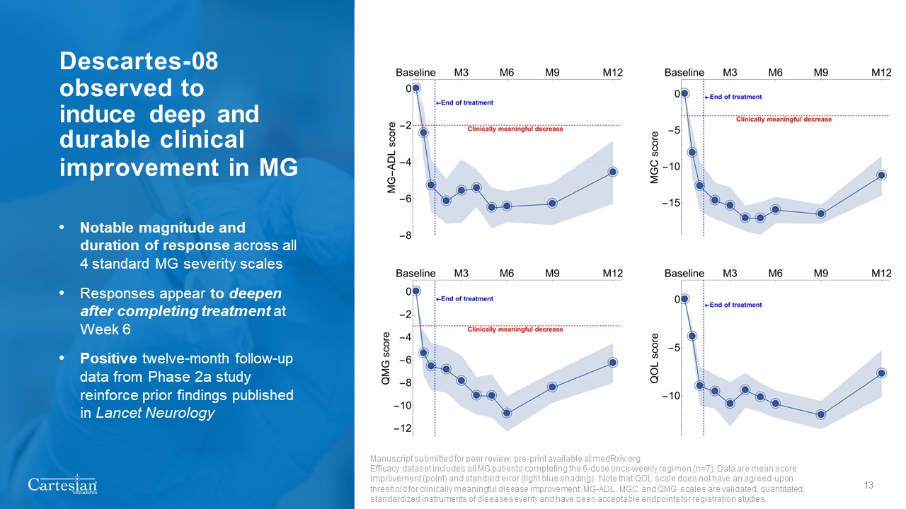 ®  THERAPEUTICS  Descartes-08 observed to  induce deep and  durable clinical  improvement in MG  Notable magnitude and duration of response across all 4 standard MG severity scales  Responses appear to deepen after completing treatment at Week 6  Positive twelve-month follow-up data from Phase 2a study reinforce prior findings published in Lancet Neurology  13  Manuscript submitted for peer review; pre-print available at medRxiv.org  Efficacy dataset includes all MG patients completing the 6-dose once-weekly regimen (n=7). Data are mean score improvement (point) and standard error (light blue shading). Note that QOL scale does not have an agreed-upon threshold for clinically meaningful disease improvement; MG-ADL, MGC and QMG scales are validated, quantitated, standardized instruments of disease severity and have been acceptable endpoints for registration studies.