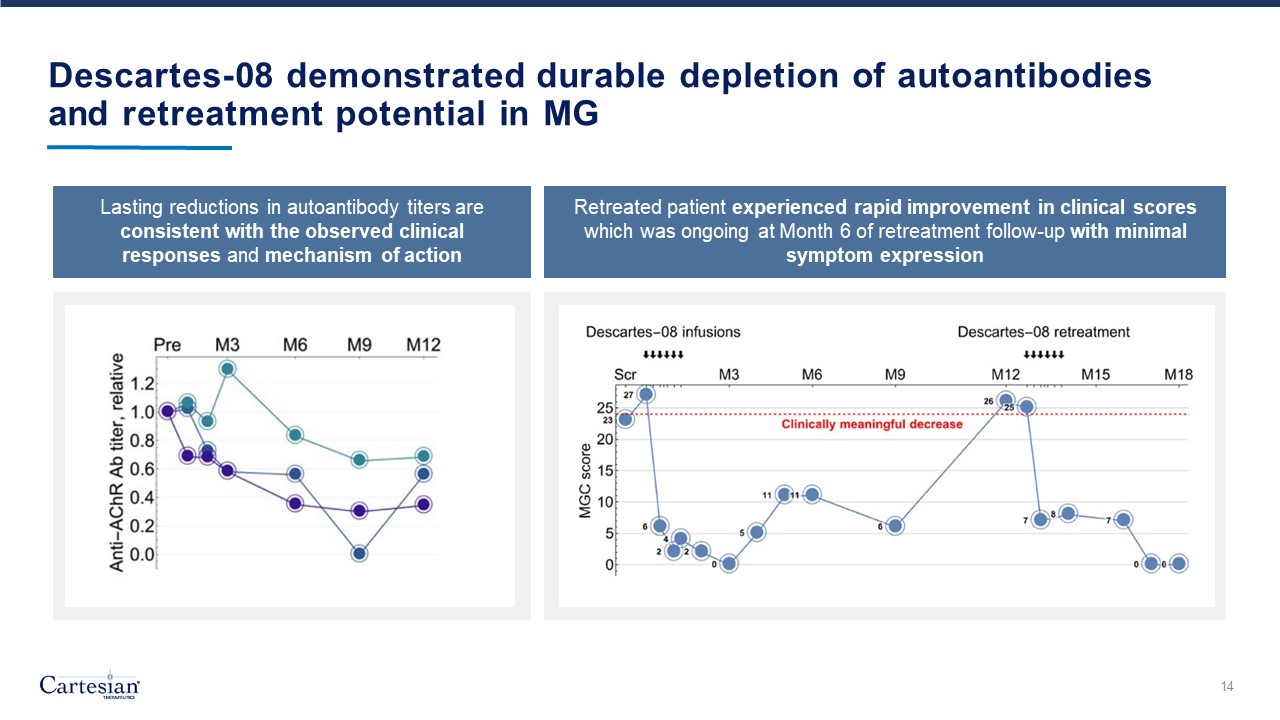 Retreated patient experienced rapid improvement in clinical scores which was ongoing at Month 6 of retreatment follow-up with minimal symptom expression  14  Descartes-08 demonstrated durable depletion of autoantibodies and retreatment potential in MG  Lasting reductions in autoantibody titers are consistent with the observed clinical responses and mechanism of action