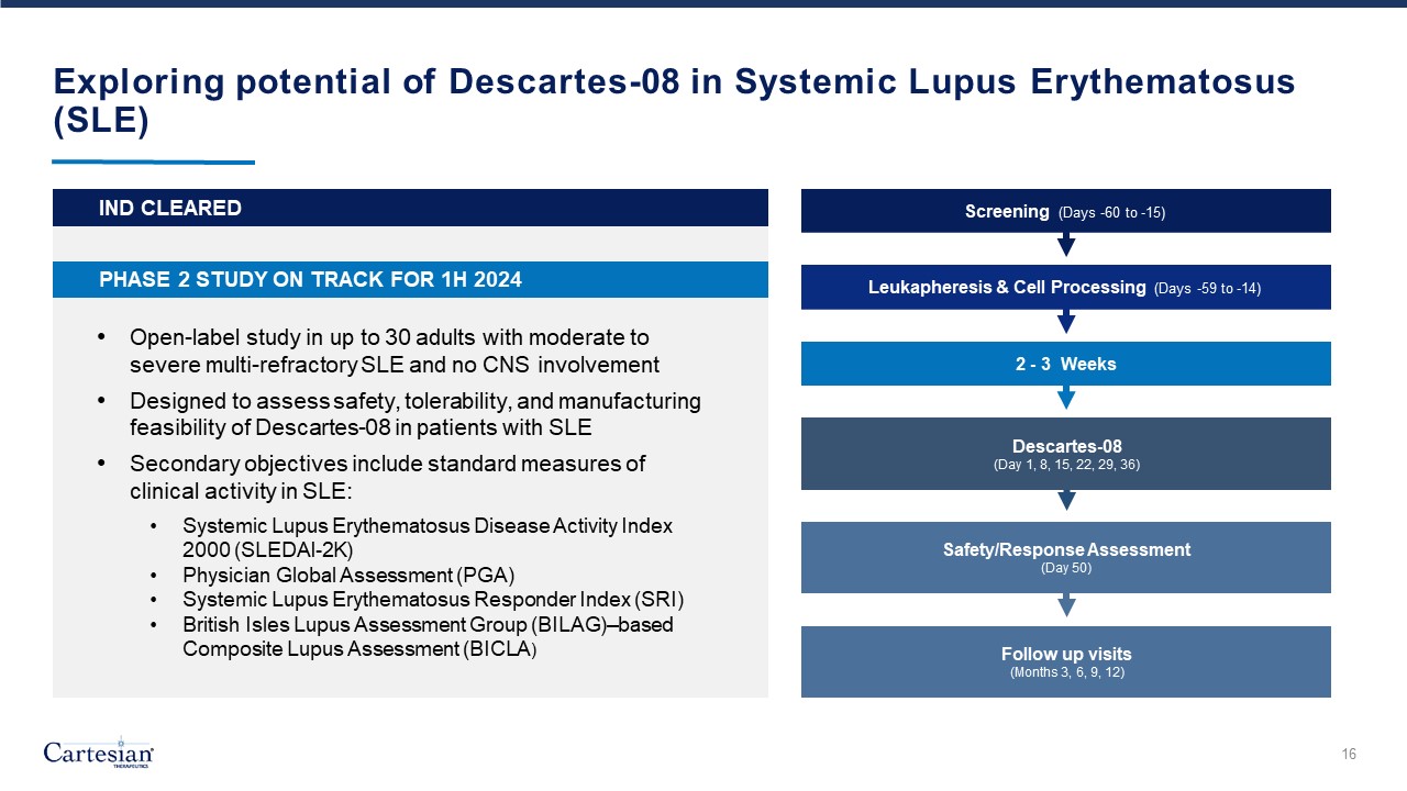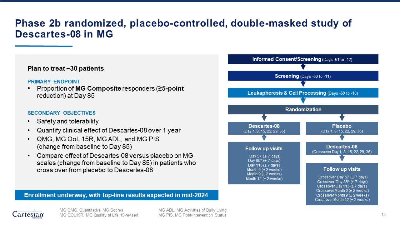 Informed Consent/Screening (Days -61 to -12)  Screening (Days -60 to -11)  Leukapheresis & Cell Processing (Days -59 to -10)  Descartes-08  (Day 1, 8, 15, 22, 29, 36)  Placebo  (Day 1, 8, 15, 22, 29, 36)  Follow up visits  Day 57 (± 7 days) Day 85* (± 7 days) Day 113 (± 7 days)  Month 6 (± 2 weeks)  Month 9 (± 2 weeks)  Month 12 (± 2 weeks)  Descartes-08  (Crossover Day 1, 8, 15, 22, 29, 36)  Follow up visits  Crossover Day 57 (± 7 days) Crossover Day 85* (± 7 days) Crossover Day 113 (± 7 days)  Crossover Month 6 (± 2 weeks)  Crossover Month 9 (± 2 weeks)  Crossover Month 12 (± 2 weeks)  Phase 2b randomized, placebo-controlled, double-masked study of Descartes-08 in MG  Enrollment underway, with top-line results expected in mid-2024  Plan to treat ~30 patients  PRIMARY ENDPOINT  Proportion of MG Composite responders (≥5-point reduction) at Day 85  SECONDARY OBJECTIVES  Safety and tolerability  Quantify clinical effect of Descartes-08 over 1 year  QMG, MG QoL 15R, MG ADL, and MG PIS  (change from baseline to Day 85)  Compare effect of Descartes-08 versus placebo on MG scales (change from baseline to Day 85) in patients who cross over from placebo to Descartes-08  15  Randomization  MG QMG, Quantitative MG Scores  MG QOL15R, MG Quality of Life 15-revised  MG ADL, MG Activities of Daily Living MG PIS, MG Post-intervention Status