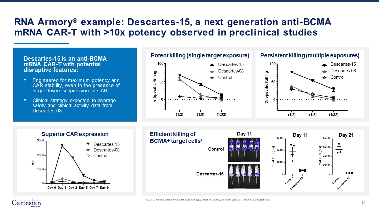 RNA Armory® example: Descartes-15, a next generation anti-BCMA mRNA CAR-T with >10x potency observed in preclinical studies  Potent killing (single target exposure)  Persistent killing (multiple exposures)  (1:2)  (1:8)  (1:32)  0  50  100  % Specific Killing  DC-15  DC-08  Vehicle EP  Descartes-15 Descartes-08 Control  (1:2)  (1:8)  (1:32)  0  100  50  % Specific Killing  DC-15  DC-08  Vehicle EP  Descartes-15 Descartes-08 Control  Descartes-15 is an anti-BCMA mRNA CAR-T with potential disruptive features:  Engineered for maximum potency and CAR stability, even in the presence of target-driven suppression of CAR  Clinical strategy expected to leverage safety and clinical activity data from Descartes-08  0  Day 0 Day 1 Day 2 Day 5 Day 7 Day 9  1000  2000  MFI  DC-15  DC-08  Vehicle EP  Control  Superior CAR expression  3000  Descartes-15  Descartes-08  Control  Descartes-15  0  2×108  4×108  6×108  8×108  Day 21  Total Flux (p/s)  Control  Descartes-15  Control  Descartes-15  0  1×107  2×107  3×107  Day 11  Total Flux (p/s)  Day 21  Day 11  Efficient killing of BCMA+ target cells1  Day 11  1 MM1-S disseminated myeloma model in NSG mice infused with either control T-cells or Descartes-15  18