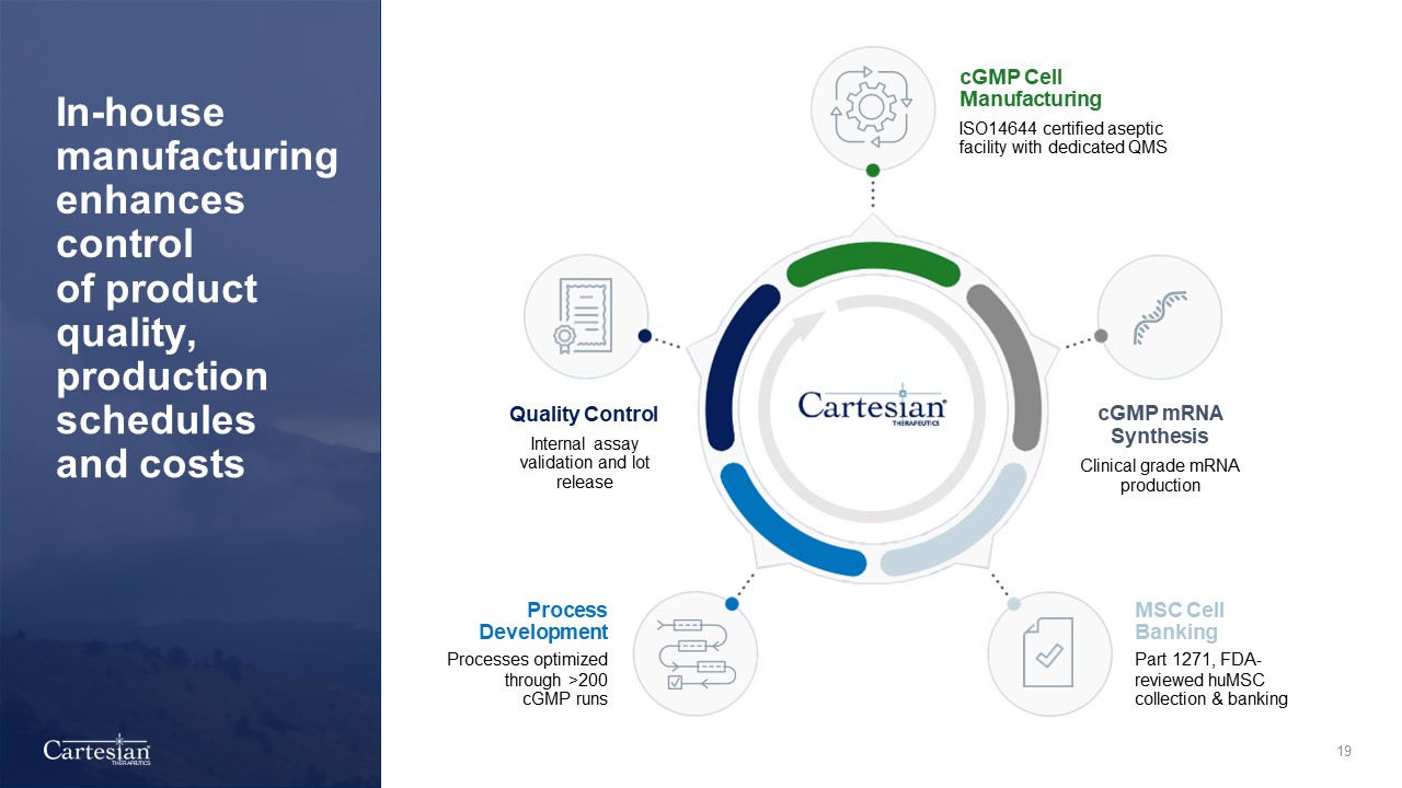®  THERAPEUTICS  19  In-house manufacturing  enhances control  of product quality, production schedules and costs  cGMP Cell Manufacturing  ISO14644 certified aseptic facility with dedicated QMS  cGMP mRNA  Synthesis  Clinical grade mRNA production  Quality Control  Internal assay validation and lot release  MSC Cell Banking  Part 1271, FDA-  reviewed huMSC collection & banking  Process Development  Processes optimized  through >200 cGMP runs