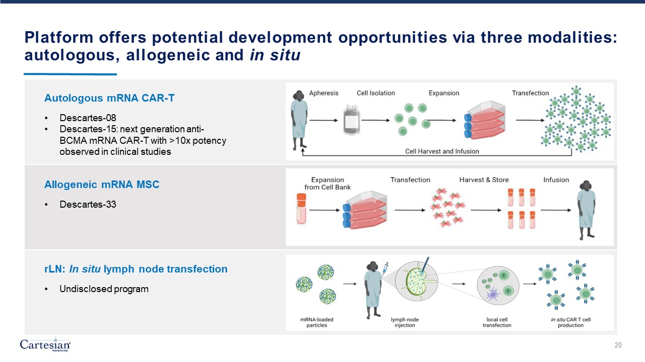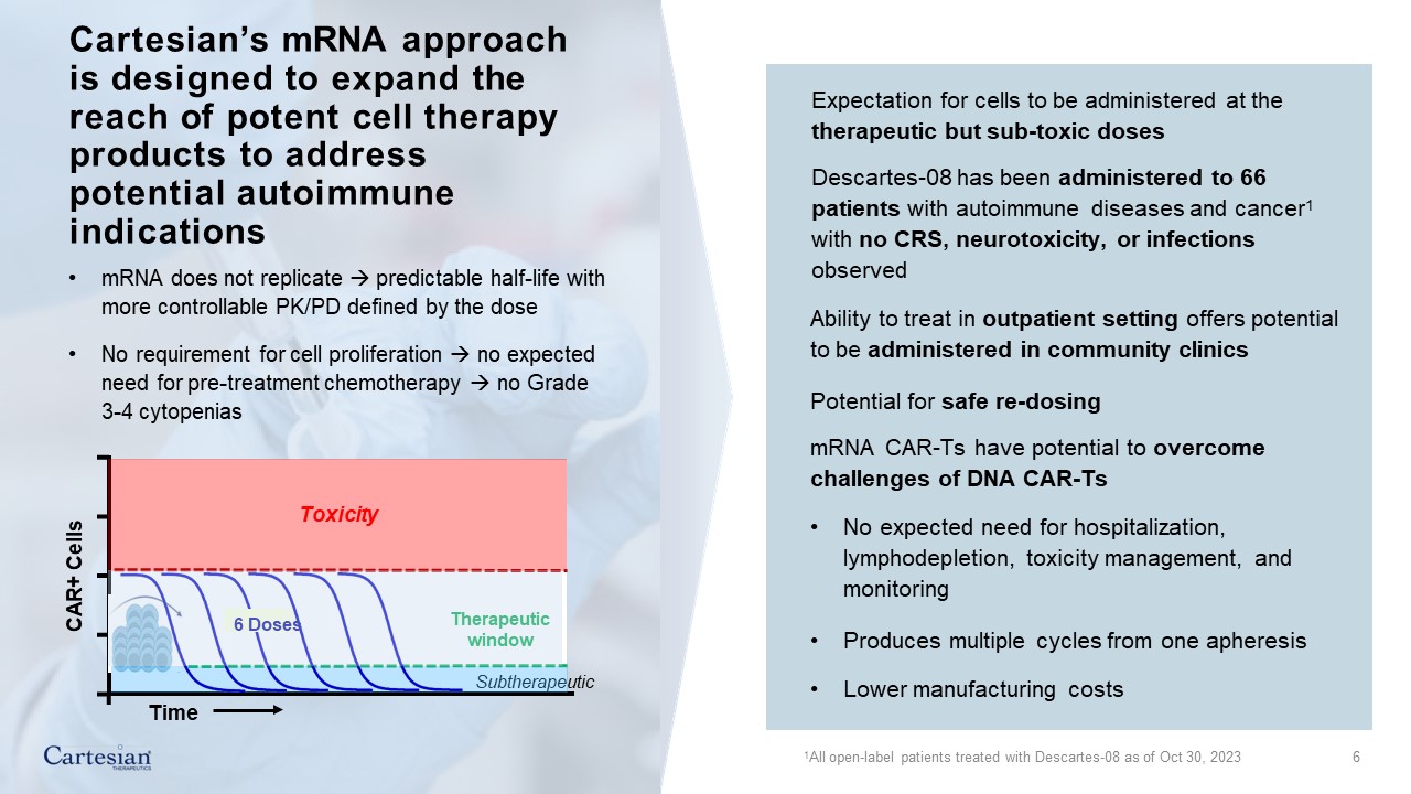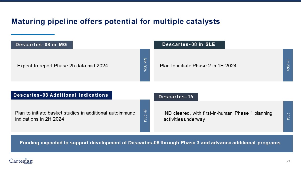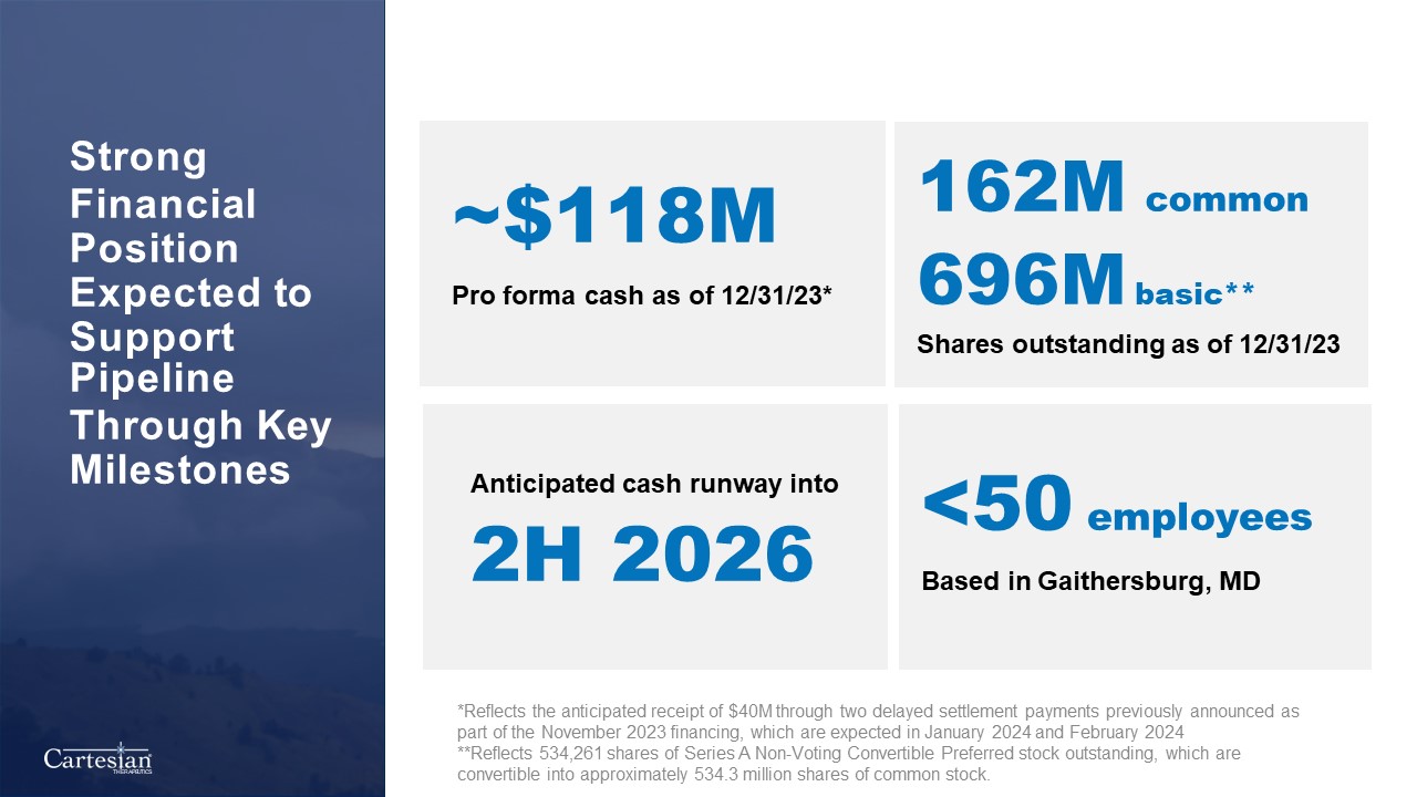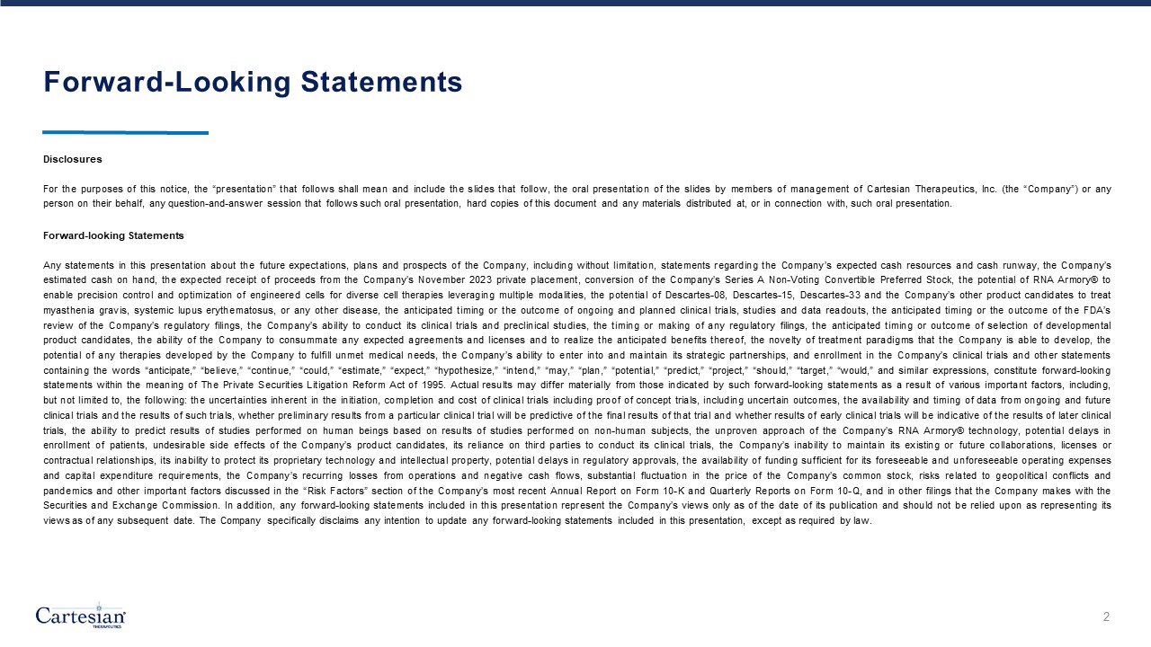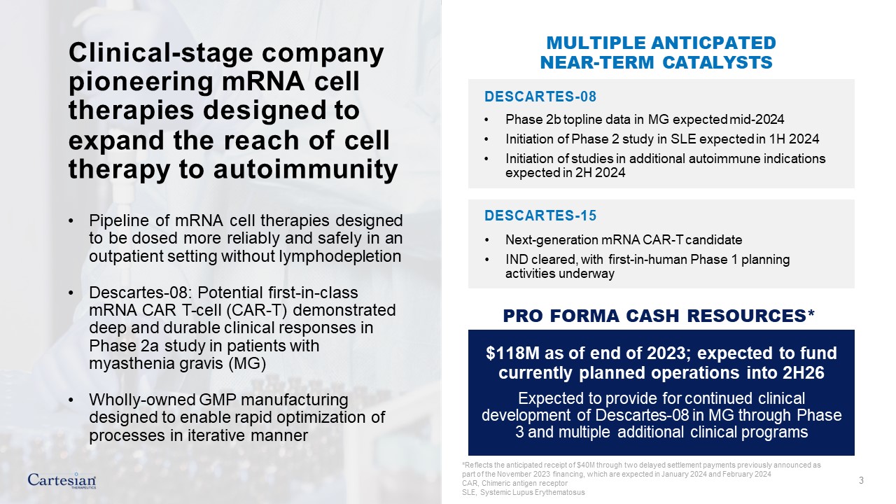 Forward-Looking Statements  Disclosures  For the purposes of this notice, the “presentation” that follows shall mean and include the slides that follow, the oral presentation of the slides by members of management of Cartesian Therapeutics, Inc. (the “Company”) or any person on their behalf, any question-and-answer session that follows such oral presentation, hard copies of this document and any materials distributed at, or in connection with, such oral presentation.  Forward-looking Statements  Any statements in this presentation about the future expectations, plans and prospects of the Company, including without limitation, statements regarding the Company’s expected cash resources and cash runway, the Company’s estimated cash on hand, the expected receipt of proceeds from the Company’s November 2023 private placement, conversion of the Company’s Series A Non-Voting Convertible Preferred Stock, the potential of RNA Armory® to enable precision control and optimization of engineered cells for diverse cell therapies leveraging multiple modalities, the potential of Descartes-08, Descartes-15, Descartes-33 and the Company’s other product candidates to treat myasthenia gravis, systemic lupus erythematosus, or any other disease, the anticipated timing or the outcome of ongoing and planned clinical trials, studies and data readouts, the anticipated timing or the outcome of the FDA’s review of the Company’s regulatory filings, the Company’s ability to conduct its clinical trials and preclinical studies, the timing or making of any regulatory filings, the anticipated timing or outcome of selection of developmental product candidates, the ability of the Company to consummate any expected agreements and licenses and to realize the anticipated benefits thereof, the novelty of treatment paradigms that the Company is able to develop, the potential of any therapies developed by the Company to fulfill unmet medical needs, the Company’s ability to enter into and maintain its strategic partnerships, and enrollment in the Company’s clinical trials and other statements containing the words “anticipate,” “believe,” “continue,” “could,” “estimate,” “expect,” “hypothesize,” “intend,” “may,” “plan,” “potential,” “predict,” “project,” “should,” “target,” “would,” and similar expressions, constitute forward-looking statements within the meaning of The Private Securities Litigation Reform Act of 1995. Actual results may differ materially from those indicated by such forward-looking statements as a result of various important factors, including, but not limited to, the following: the uncertainties inherent in the initiation, completion and cost of clinical trials including proof of concept trials, including uncertain outcomes, the availability and timing of data from ongoing and future clinical trials and the results of such trials, whether preliminary results from a particular clinical trial will be predictive of the final results of that trial and whether results of early clinical trials will be indicative of the results of later clinical trials, the ability to predict results of studies performed on human beings based on results of studies performed on non-human subjects, the unproven approach of the Company’s RNA Armory® technology, potential delays in enrollment of patients, undesirable side effects of the Company’s product candidates, its reliance on third parties to conduct its clinical trials, the Company’s inability to maintain its existing or future collaborations, licenses or contractual relationships, its inability to protect its proprietary technology and intellectual property, potential delays in regulatory approvals, the availability of funding sufficient for its foreseeable and unforeseeable operating expenses and capital expenditure requirements, the Company’s recurring losses from operations and negative cash flows, substantial fluctuation in the price of the Company’s common stock, risks related to geopolitical conflicts and pandemics and other important factors discussed in the “Risk Factors” section of the Company’s most recent Annual Report on Form 10-K and Quarterly Reports on Form 10-Q, and in other filings that the Company makes with the Securities and Exchange Commission. In addition, any forward-looking statements included in this presentation represent the Company’s views only as of the date of its publication and should not be relied upon as representing its views as of any subsequent date. The Company specifically disclaims any intention to update any forward-looking statements included in this presentation, except as required by law.  2