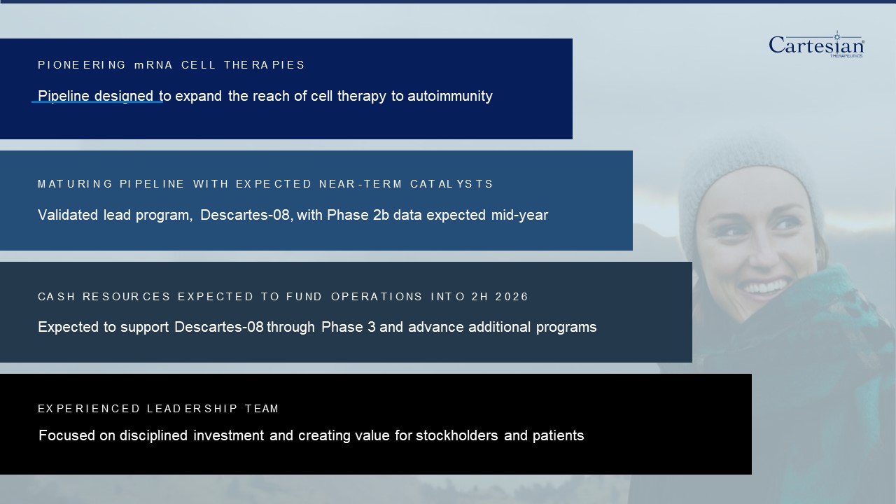 ®  THERAPEUTICS  P I O NE E RI NG m RNA CE L L T HE RA P I E S   Pipeline designed to expand the reach of cell therapy to autoimmunity  M AT U RI N G PI PEL I NE W I T H EX PE C T E D N EAR - T E R M CAT AL YS T S  Validated lead program, Descartes-08, with Phase 2b data expected mid-year  CA S H RE S O UR C E S E X P E C T E D T O F U ND O P E R A T I O NS I NT O 2 H 2 0 2 6  Expected to support Descartes-08 through Phase 3 and advance additional programs  ®  THERAPEUTICS  EX PE R I E N C E D L EAD ER S H I P T EAM   Focused on disciplined investment and creating value for stockholders and patients