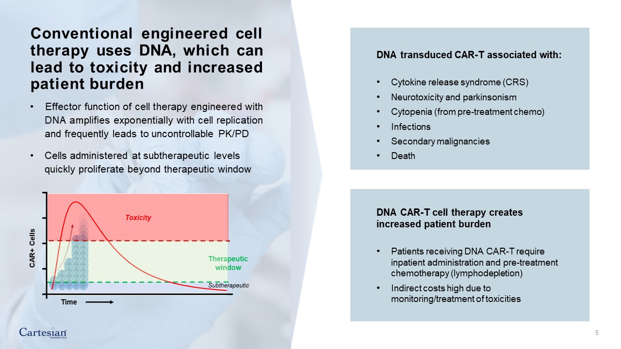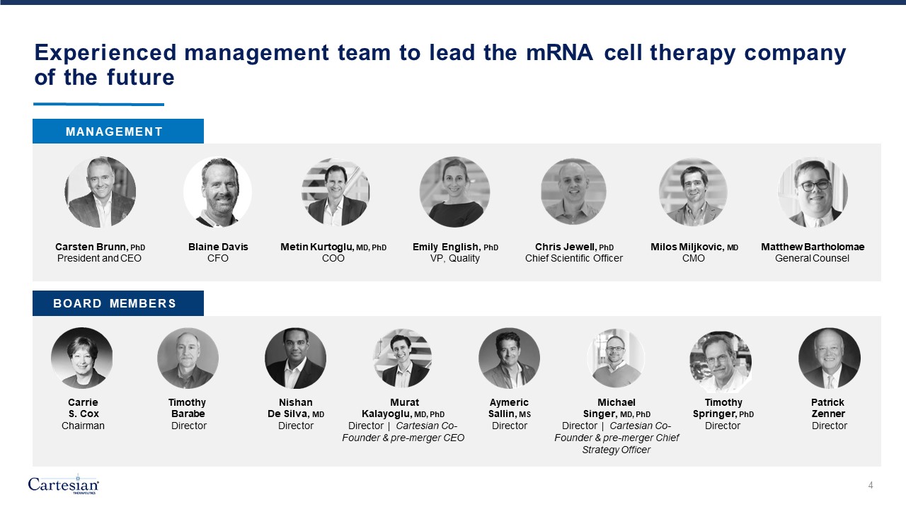 Experienced management team to lead the mRNA cell therapy company of the future  Matthew Bartholomae  General Counsel  Metin Kurtoglu, MD, PhD  COO  Milos Miljkovic, MD  CMO  Blaine Davis  CFO  Chris Jewell, PhD  Chief Scientific Officer  Carsten Brunn, PhD  President and CEO  MANAGEMENT  Emily English, PhD  VP, Quality  4  Murat Kalayoglu, MD, PhD  Director | Cartesian Co- Founder & pre-merger CEO  Timothy Springer, PhD Director  Carrie  S. Cox  Chairman  BOARD MEMBERS  Michael Singer, MD, PhD  Director | Cartesian Co- Founder & pre-merger Chief Strategy Officer  Timothy Barabe Director  Nishan De Silva, MD  Director  Aymeric Sallin, MS Director  Patrick Zenner Director