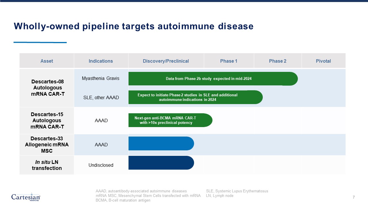 6  Time  Therapeutic window  Subtherapeutic  Toxicity  CAR+ Cells  6 Doses  Expectation for cells to be administered at the  therapeutic but sub-toxic doses  Descartes-08 has been administered to 66 patients with autoimmune diseases and cancer1 with no CRS, neurotoxicity, or infections observed  Ability to treat in outpatient setting offers potential to be administered in community clinics  Potential for safe re-dosing  mRNA CAR-Ts have potential to overcome challenges of DNA CAR-Ts  No expected need for hospitalization, lymphodepletion, toxicity management, and monitoring  Produces multiple cycles from one apheresis  Lower manufacturing costs  1All open-label patients treated with Descartes-08 as of Oct 30, 2023  Cartesian’s mRNA approach is designed to expand the reach of potent cell therapy products to address  potential autoimmune indications  mRNA does not replicate  predictable half-life with more controllable PK/PD defined by the dose  No requirement for cell proliferation  no expected need for pre-treatment chemotherapy  no Grade 3-4 cytopenias